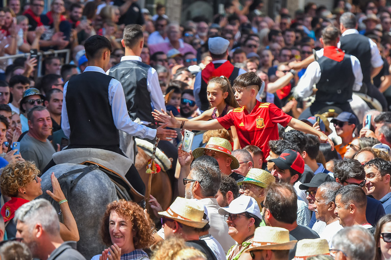 El astado negro que se ha quedado rezagado al salir del toril ha sido acompañado con astucia por los jinetes a lo largo de la calle Colón, alcanzando la plaza de la Cueva Santa sin incidentes. El público ha disfrutado de una Entrada con un poco más de duración que los días anteriores por la demora de este toro, sumando 54,51 segundos de carrera en la que la belleza del evento ha quedado plasmada un día más.