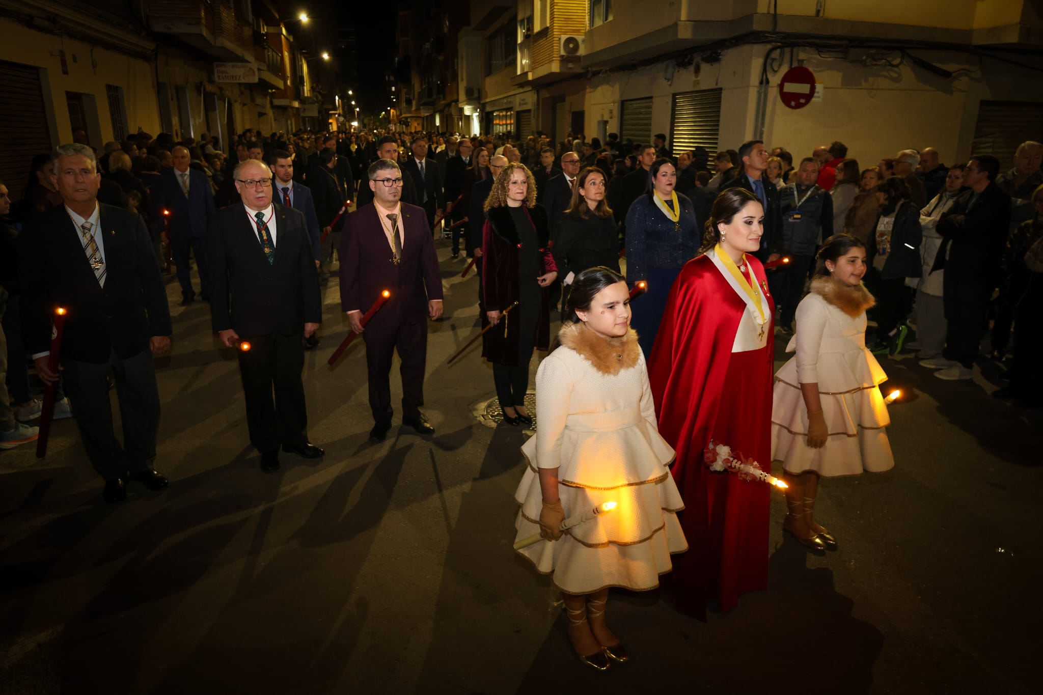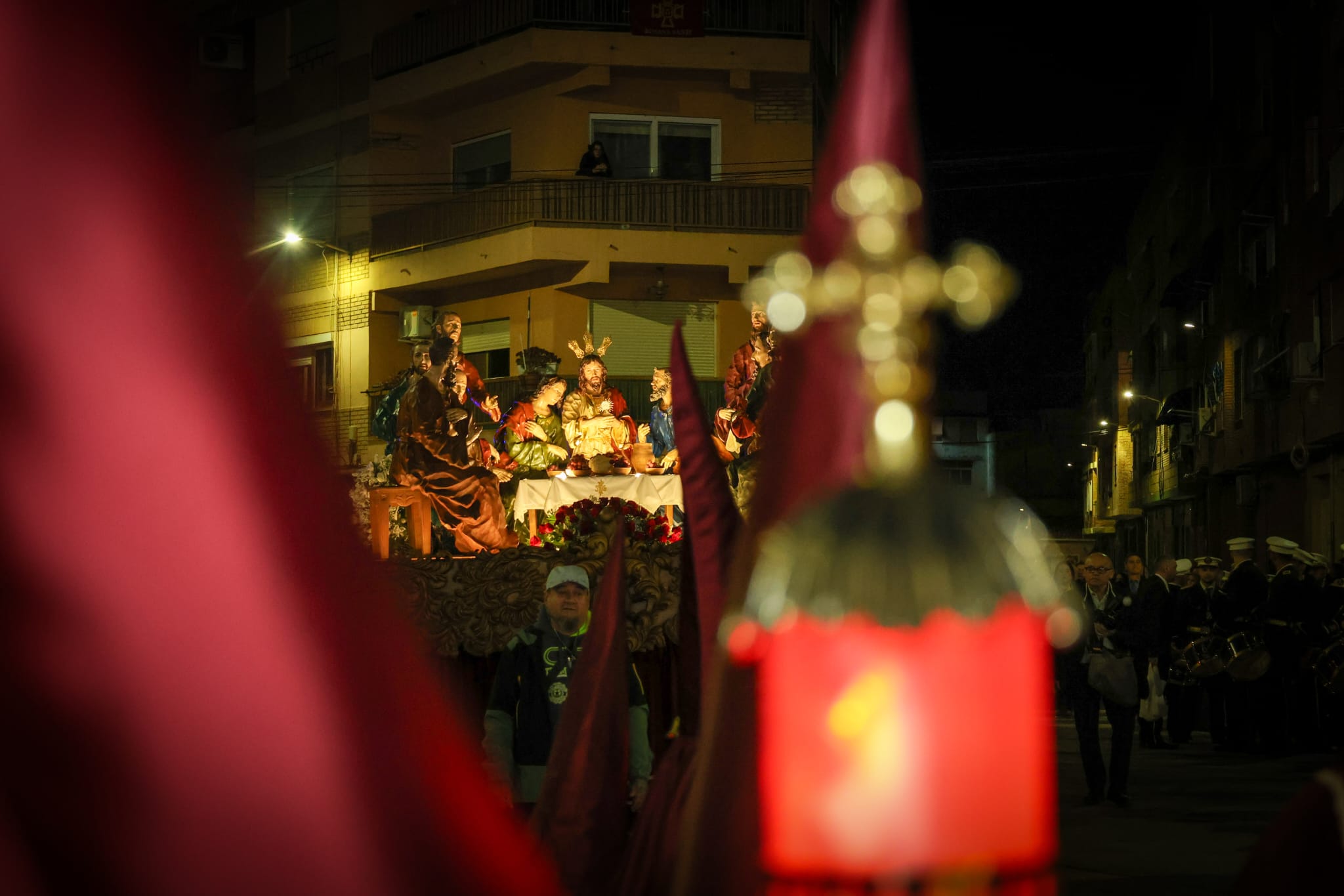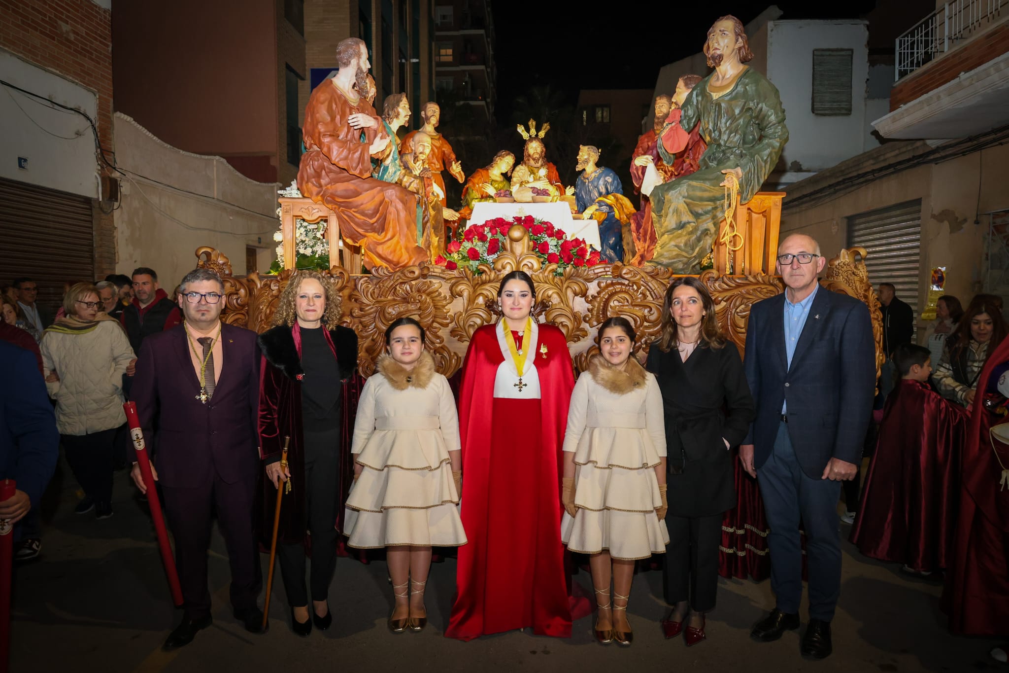 El momento culminante del día llegó a las 22:00 horas con la celebración de dos traslados procesionales de gran relevancia. Por un lado, tuvo lugar el Traslado del Paso de la Santa Cena, que partió desde la Parroquia de San José en dirección a la Casa Museo de la Semana Santa. Este acto contó con el acompañamiento de los Hermanos Heraldos del Evangelio y la Banda de Tambores y Cornetas Nuestra Señora del Redentor, aportando solemnidad al recorrido por el barrio del Poble Nou.