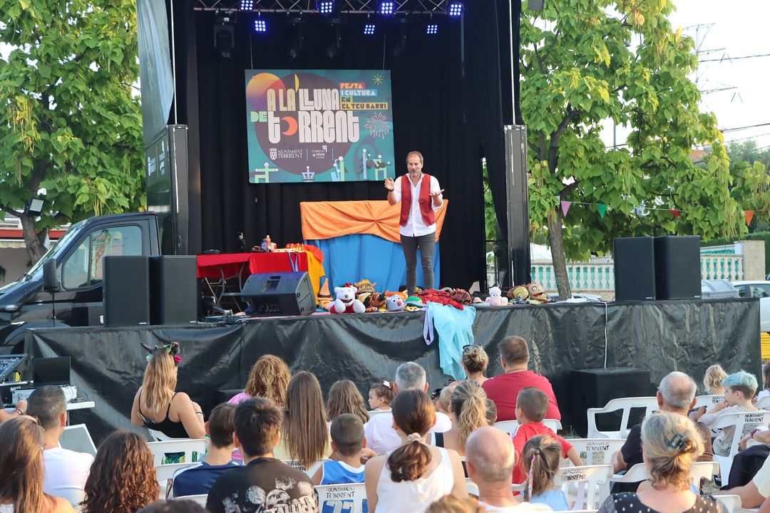 La ciudad de Torrent continúa consolidando durante este mes de agosto su apuesta por la cultura y el entretenimiento en los barrios y urbanizaciones con la iniciativa “A la Lluna de Torrent”, un programa que por segundo verano consecutivo convierte plazas, calles y parques en escenarios abiertos para toda la ciudadanía. La propuesta, organizada por el Ayuntamiento de Torrent, ofrece fines de semana repletos de actividades culturales, musicales, teatrales y de humor, además de cine al aire libre, con el objetivo de acercar espectáculos gratuitos a los vecinos que permanecen en la ciudad en estas fechas estivales.