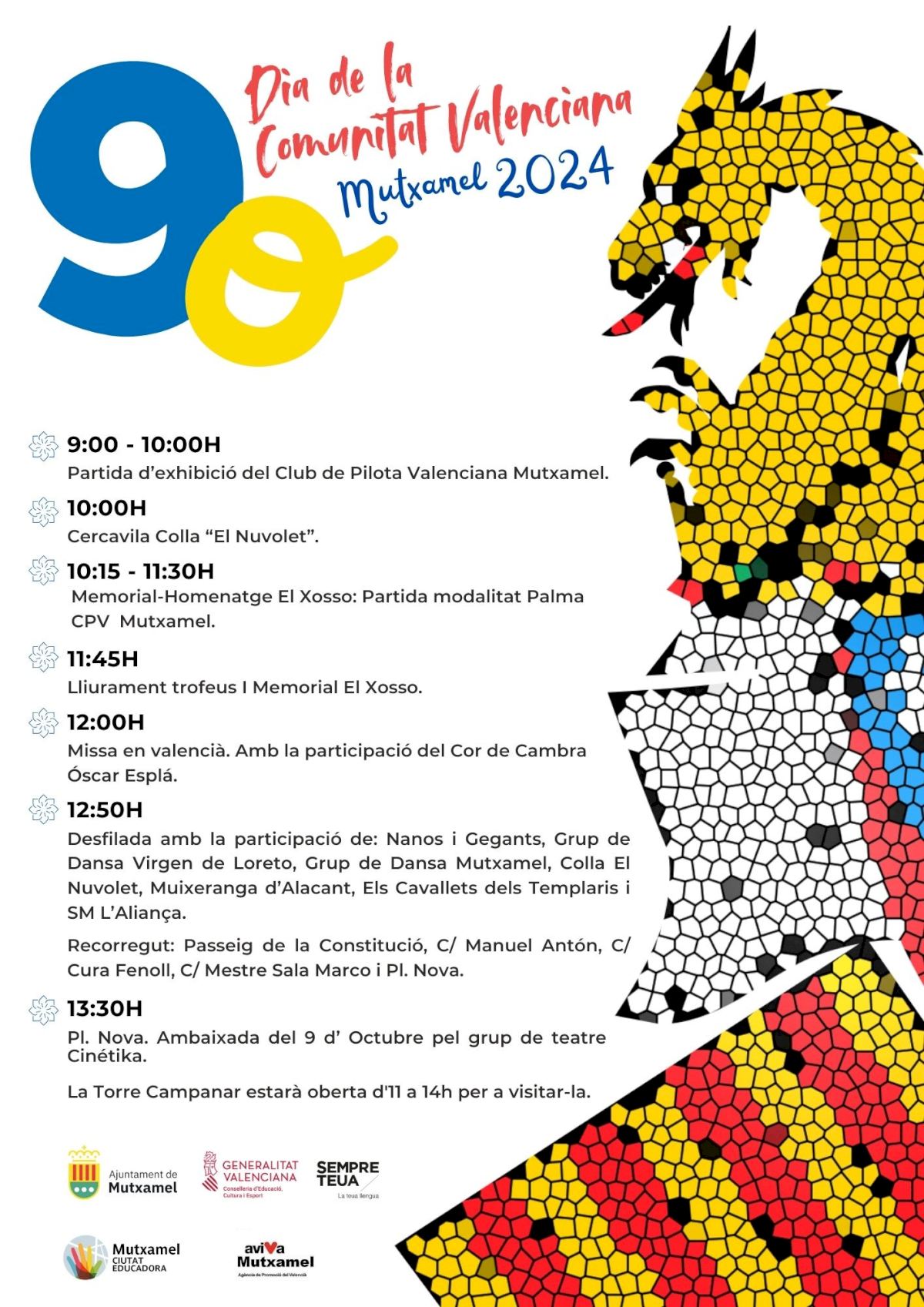 L’Ajuntament de Mutxamel commemorarà com és tradició el 9 d’Octubre, Dia de la Comunitat Valenciana. La regidoria d’Ús i Promoció del Valencià ha organitzat diferents activitats per a celebrar aquesta festivitat en la qual es rememora l’entrada a la ciutat de València del rei Jaume I El Conqueridor, en 1238. Les activitats arrancaran a les 9.00 hores del matí amb una partida d’exhibició del Club de Pilota Valenciana de Mutxamel, amb la finalitat de continuar donant a conéixer aquesta disciplina esportiva amb segell valencià. A les 10.00 hores, la Colla de Dolçainers i Tabaleters “El Nuvolet”, realitzarà una cercavila pel municipi per a anunciar al veïnat la festivitat.