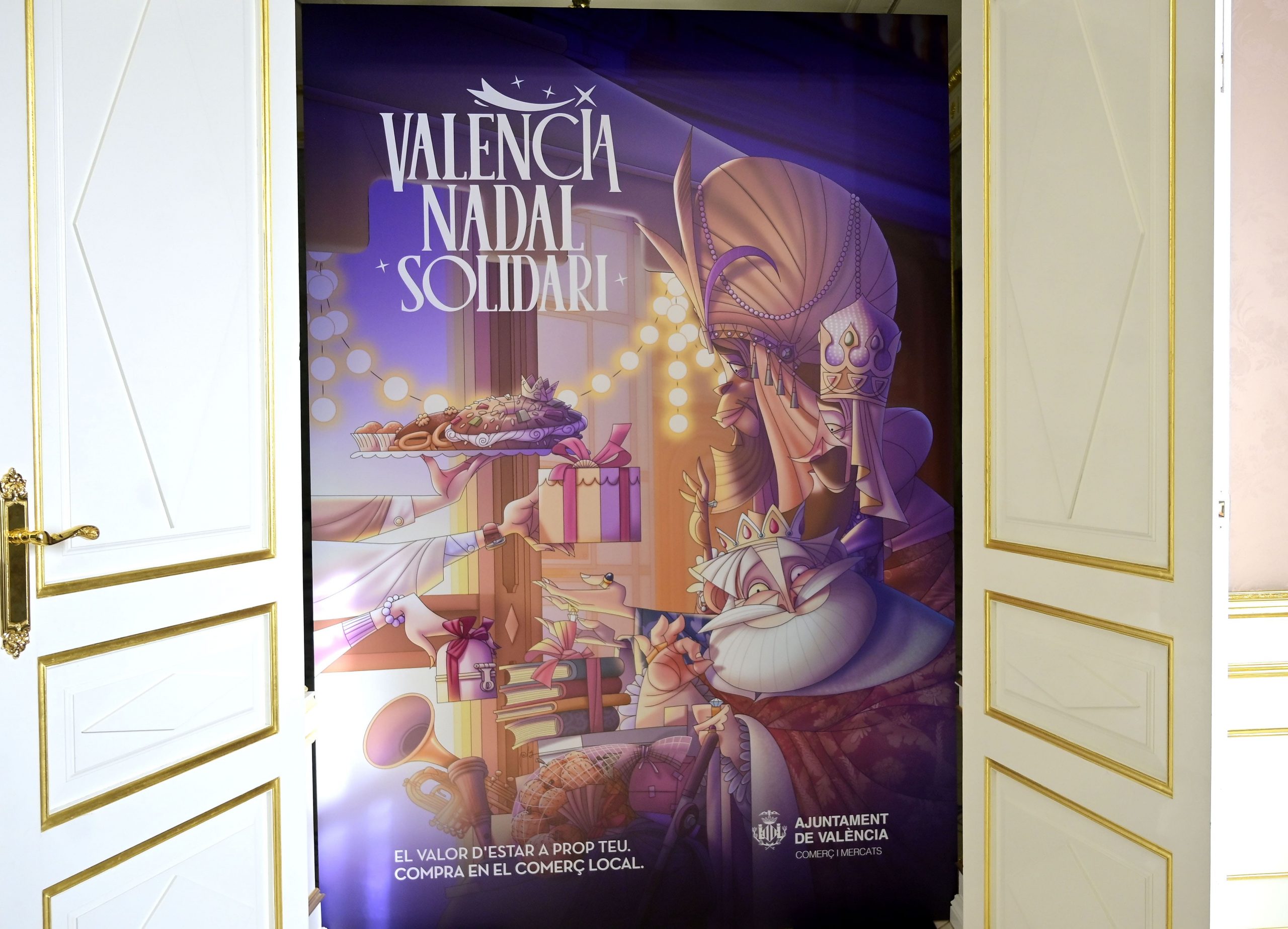 El cartel, que representa a los Reyes del Oriente ante el escaparate de una tienda, incluye regalos y productos tan diversos como libros, instrumentos musicales, dulces o indumentaria, entre otros productos típicamente valencianos, e incluye un cartel que reza “València, Navidad solidaria. El valor de estar cerca de ti. Compra en el comercio local”.