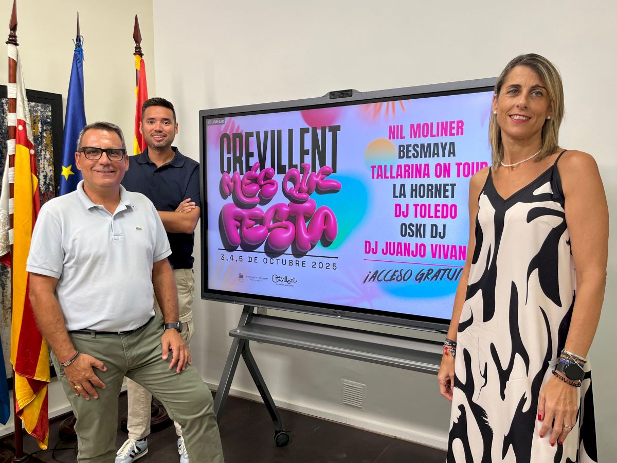 La alcaldesa Lourdes Aznar Miralles, junto con el concejal de Fiestas, Antonio Candel Rives, y de Ocio, Pedro García Magro, han presentado este miércoles el cartel de la Barraca Municipal 2025 en el marco de las fiestas patronales y de Moros y Cristianos de Crevillent. “Nil Moliner, Besmaya, La Hornet y el show de Tallarina On Tour lideran este potente cartel de actuaciones gratuitas para disfrutar durante nuestras fiestas”, ha destacado la alcaldesa Lourdes Aznar.