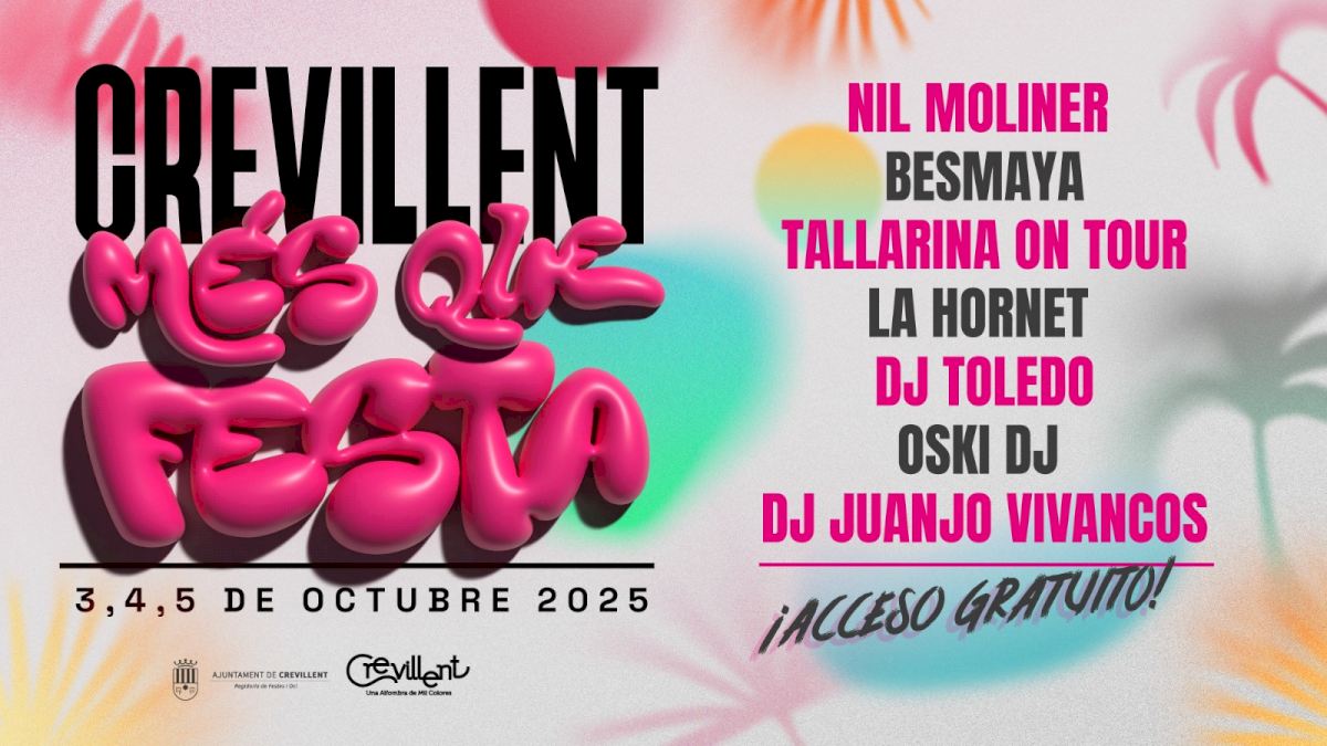 El sábado 4 de octubre será el turno de bailar y cantar con Nil Moliner, cantante catalán con una reconocida trayectoria sobre los escenarios de grandes festivales de nuestro país en los últimos años y afronta actualmente su gira en solitario “Siente el Nexo” con próximas paradas, por ejemplo, en el Movistar Arena de Madrid y el Palau Sant Jordi en Barcelona. “Este artista tiene 2,5 millones de reproducciones mensuales en Spotify y suena mucho en radios musicales”, ha detallado el concejal. Esta noche se complementará con la sesión de Dj Juanjo Vivancos, que ya ha actuado anteriormente en Crevillent en eventos como el Paellas Fest en la Plaza de la Comunitat Valenciana y en la fiesta de Mig Any en la Plaza de la Constitución. Como colofón, contaremos con Dj Toledo, natural de Castilla La Mancha, con más de 20 años de experiencia y con su estilo comercial/urbano.