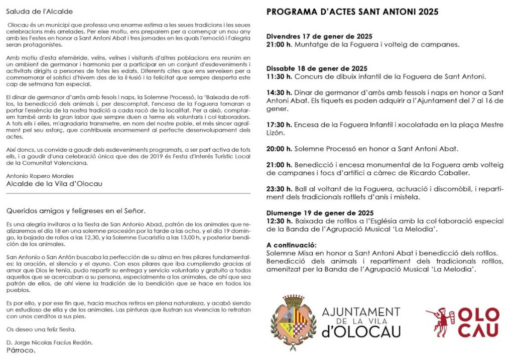 En paraules de l’alcalde d’Olocau, Antonio Ropero, el propòsit del programa que s’ha preparat per a commemorar Sant Antoni Abat és “posar en valor el caràcter popular d’esta celebració tan arrelada, al mateix temps que es manté tota la seua essència”. Segons el primer edil, “hem volgut continuar apostant per allò que més ens identifica, per la nostra tradició, un aspecte clau perquè este esdeveniment seguisca sent un gran atractiu turístic, com ho demostra el fet de ser, des de 2019, Festa d’Interés Turístic Local de la Comunitat Valenciana”.