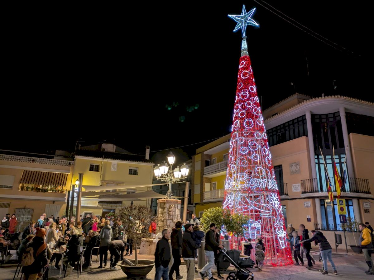 En primer lloc, s’ha servit xocolate calent acompanyant de valencianes als assistents, una manera d’endolcir els instants previs al moment més esperat per tots. A continuació, l’alcalde, Antonio Ropero, i els allí presents han realitzat el compte enrere que ha conduït a la posada en marxa les llums de l’arbre, que, juntament amb les que estan situades als carrers, ompliran la localitat d’ambient nadalenc al llarg de les pròximes setmanes.