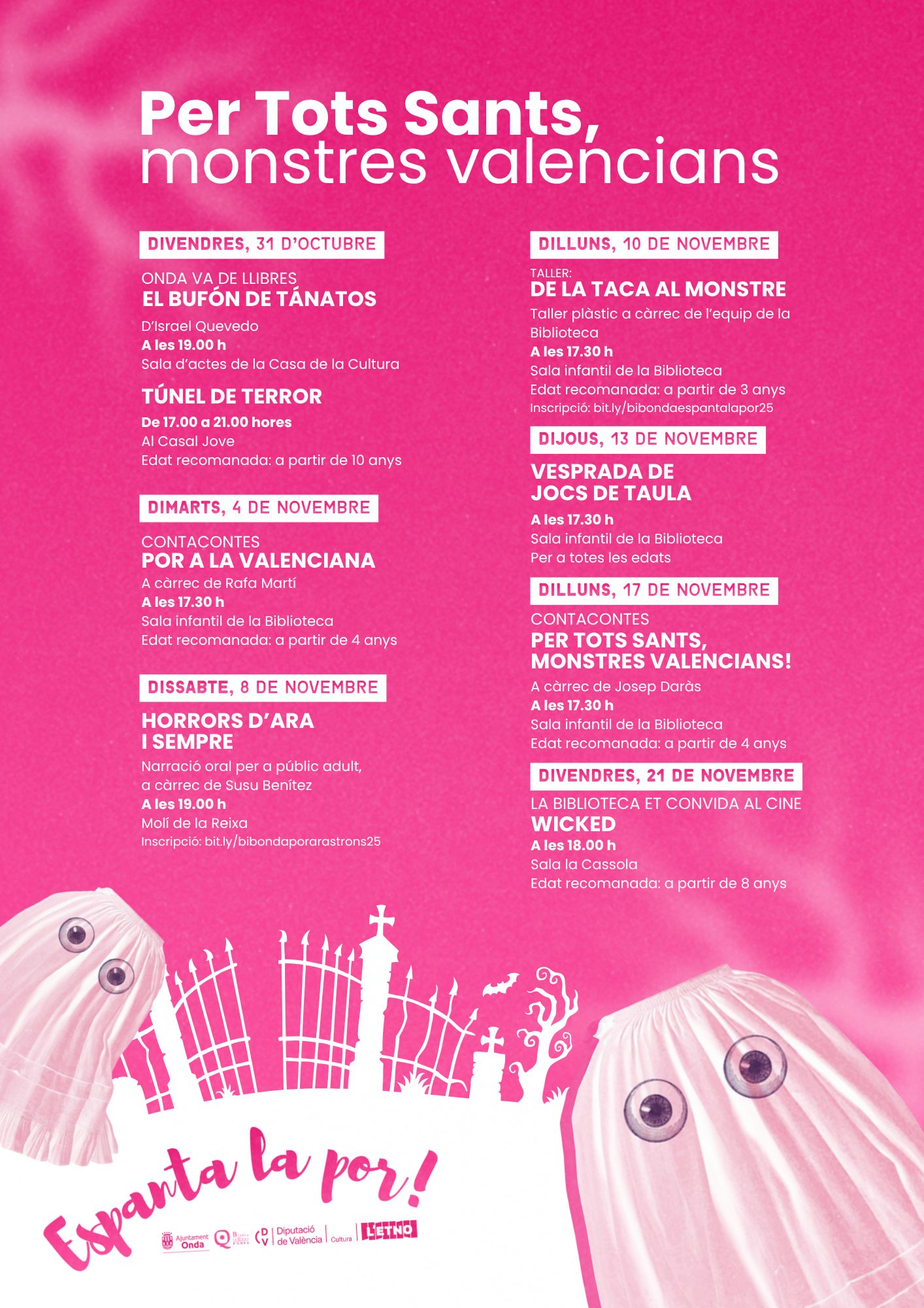 El Ayuntamiento de Onda, a través de la Biblioteca Municipal, se suma un año más a la campaña ‘Espanta la por. Per Tots Sants, monstres valencians!’, impulsada por la Generalitat Valenciana, con el objetivo de recuperar los personajes, leyendas y monstruos del imaginario popular valenciano con motivo de la festividad de Todos los Santos.