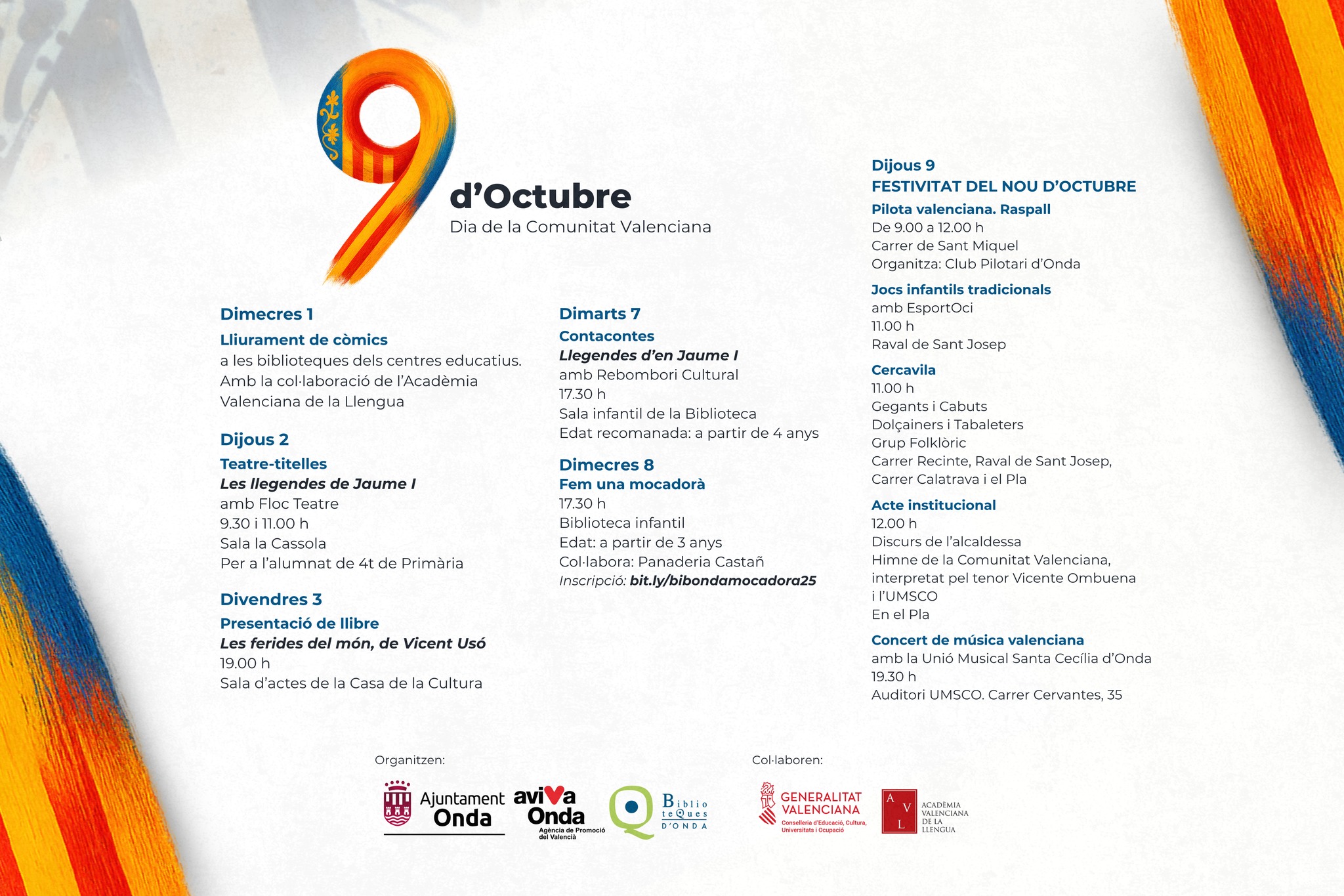 L’Ajuntament d’Onda ha presentat la programació d’actes amb motiu del Nou d’Octubre, Dia de la Comunitat Valenciana, que omplirà la ciutat d’activitats culturals i lúdiques per a totes les edats. La regidora d’Educació, María Ojeda, i el regidor de Cultura i Joventut, Daniel Álvaro, han detallat les propostes que combinen música, teatre, folklore, esports tradicionals i activitats familiars.