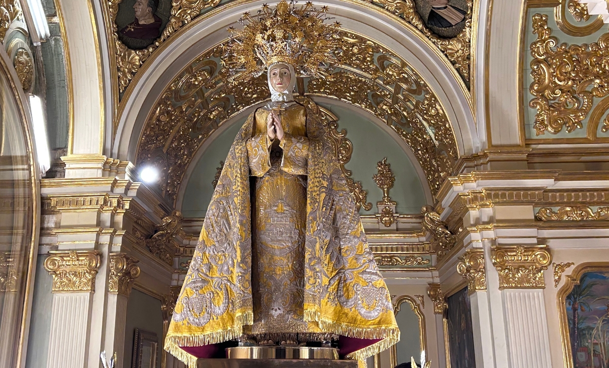 La Virgen de la Asunción ya luce en el camarín de la Basílica de Santa María con el tradicional manto de las Clarisas tras la minuciosa labor de restauración integral llevada a cabo en el Instituto Valenciano de Conservación, Restauración e Investigación (IVCR+I) dependiente del Consell.