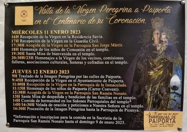 La próximas visitas de la imagen peregrina de la Virgen serán a Paterna los días 21 y 22 de enero; a Silla del 27 a 29 de enero; a Alicante el 4 y 5 de febrero, a la Vall D’Uixó del 10 al 12 de febrero y a Desamparados y Orihuela 18 y 19 de febrero.