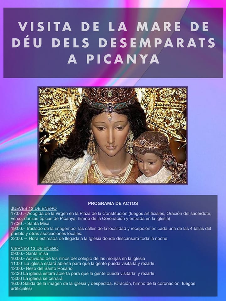 A Picanya llegará a las 17 horas y recibirá una acogida en la plaza de la Constitución tras la que entrará en la parroquia y tendrá lugar una misa seguida de un traslado de la imagen por las calles de la localidad y recepción en cada una de las cuatro fallas de la localidad y otras asociaciones locales.
