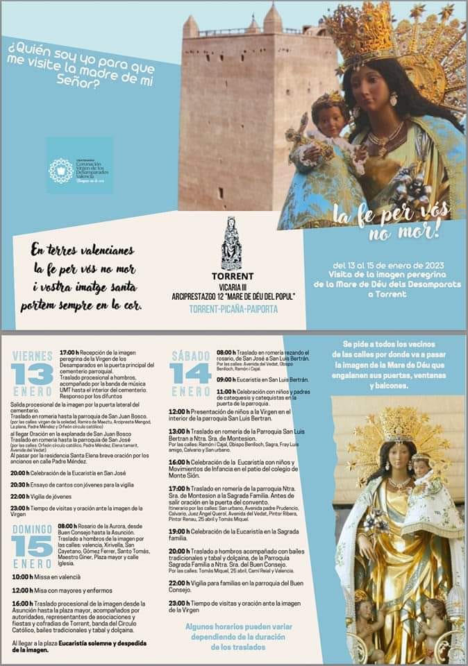 Paiporta, Picanya y Torrent acogen esta semana la visita especial de la imagen peregrina de la Virgen de los Desamparados que se enmarca en el Año Jubilar del Centenario de la Coronación Canónica.