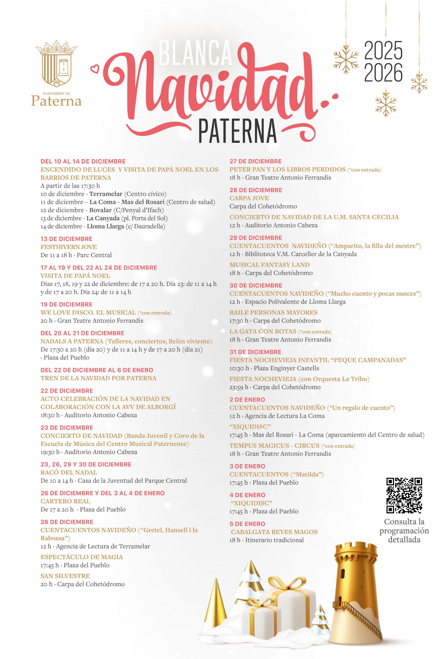 Junto a estas iniciativas culturales y festivas, se suman otros actos de celebración de la Navidad en colaboración con la Asociación de Vecinos de Alborgí, el lunes 22 de diciembre a las 18:30 horas que tendrá lugar en el Auditori. Del mismo modo, el martes 23 de diciembre, el Centro Musical Paternense ofrecerá su tradicional Concierto de Navidad a las 19:30 horas.