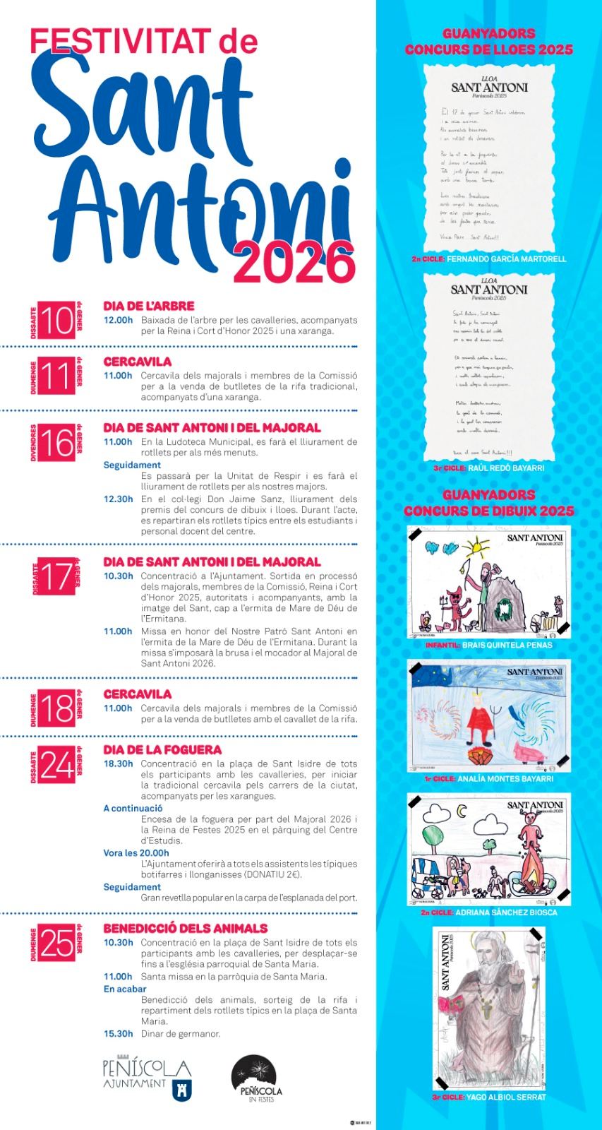 - El dia 25 a les 10.30h se celebrarà la missa en la parròquia de Santa Maria i en acabar es procedirà a la benedicció d’animals en la plaça de Santa Maria després de la qual es durà a terme el sorteig de la rifa.