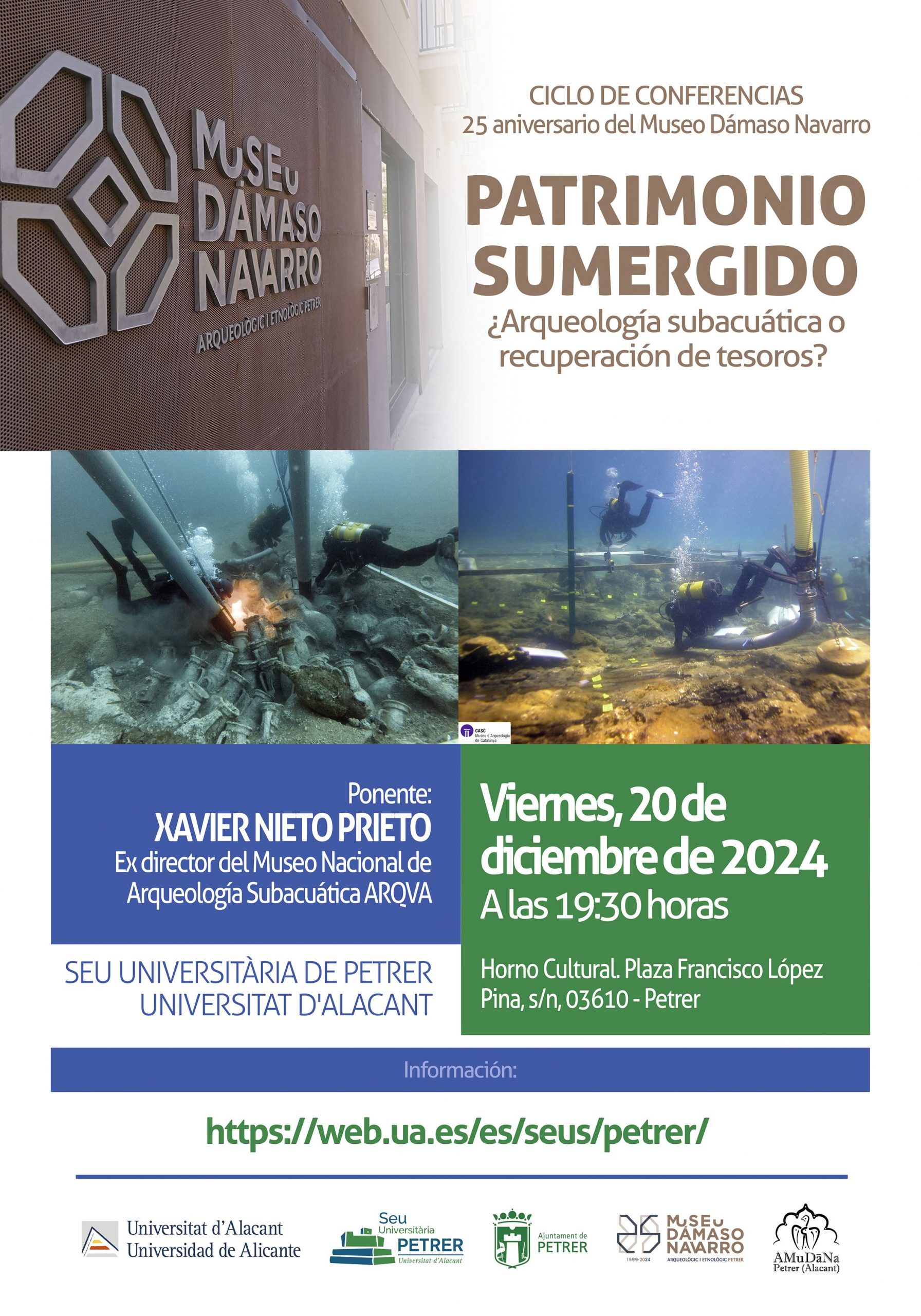 Finalmente, Fernando Tendero ha detallado el ciclo de conferencias que se ha estructurado en torno a temas clave relacionados con el patrimonio histórico y arqueológico, abordando desde los hallazgos más destacados hasta los retos actuales en su conservación. “Hemos distribuido una conferencia al mes hasta el mes de junio”, ha indicado Tendero explicando que comenzarán este viernes día 20, a  las 19:30 h, en el Forn Cultural, con la titulada “El patrimonio sumergido, ¿Arqueología subacuática o recuperación de tesoros?”, por Xavier Nieto Prieto, ex director del Museo Nacional de Arqueología Subacuática  ARQVA, del Ministerio de Cultura, y también ha sido el gestor y el creador del Servicio de Subacuático de la Generalitat catalana, también desde sus inicios hasta ahora, y tiene la peculiaridad de que estuvo viviendo en Petrer, desde que era niño hasta hasta la adolescencia, porque su padre trabajaba en Correos.