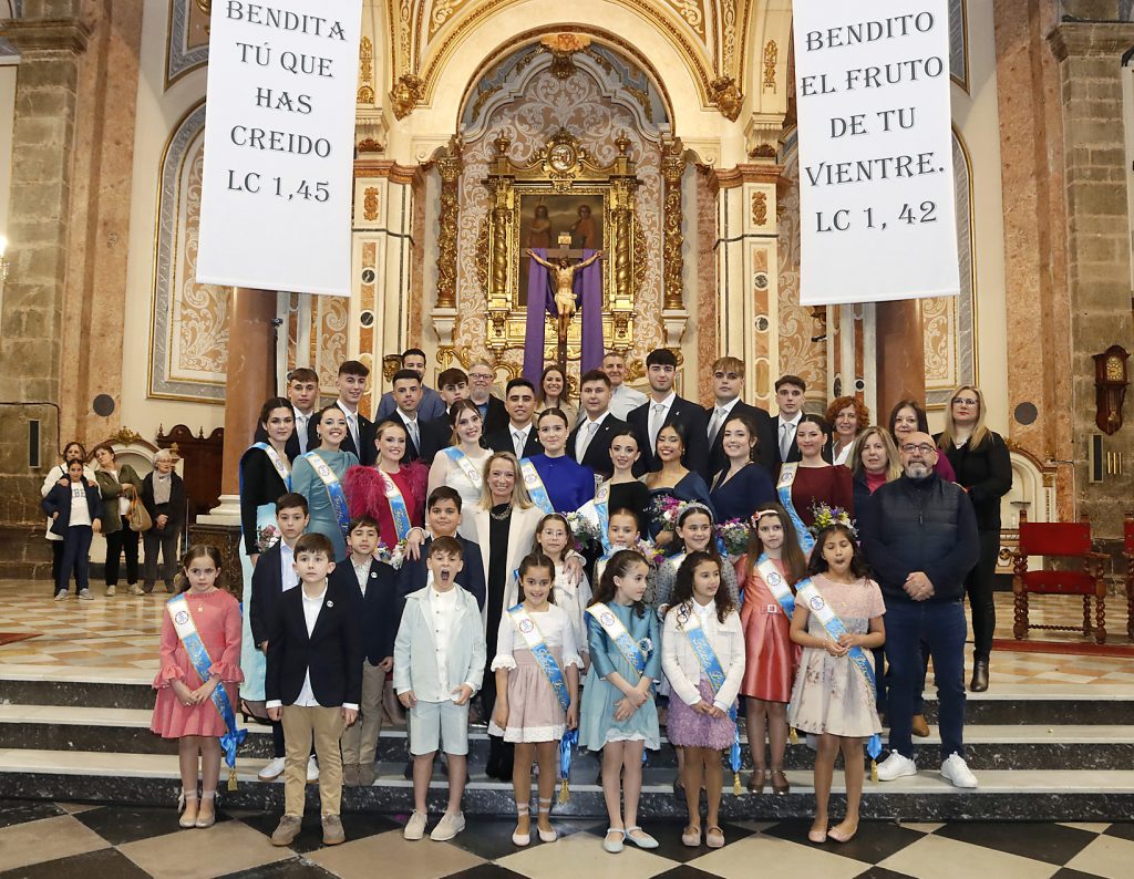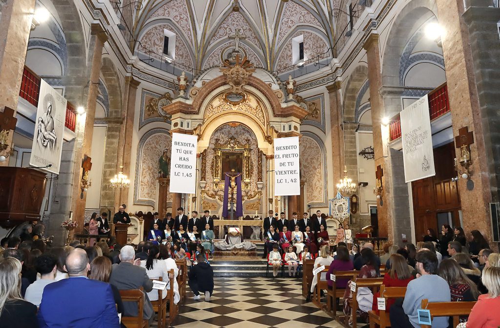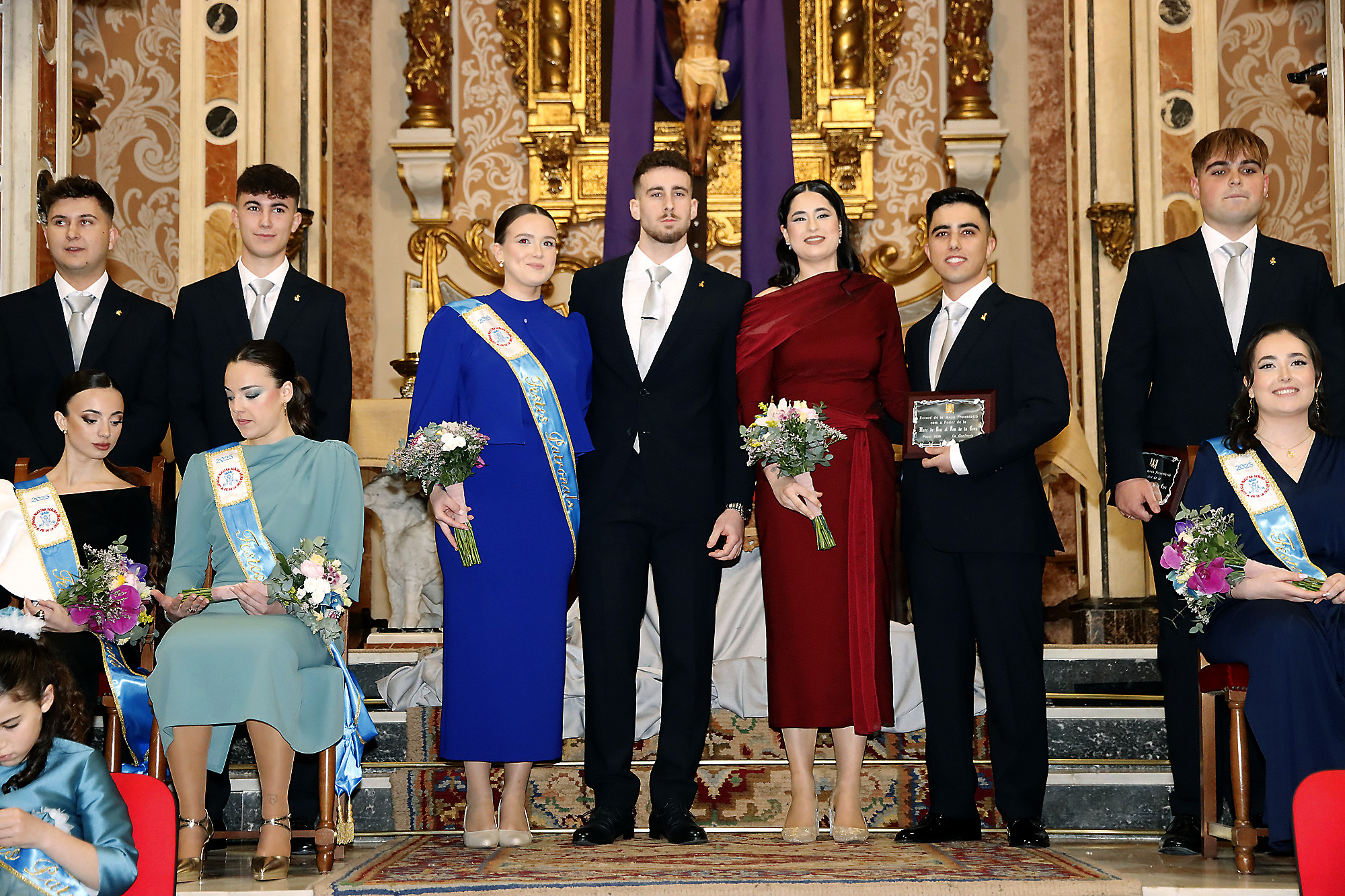 A continuación, desfilaron por la iglesia hasta el altar las nueve parejas de jóvenes que serán los responsables de la programación de septiembre: Miquel García y Elia Sebastiá, Vicente Ortiz y María Martínez, Álvaro Escot y Ana María Romero, Adrián Felguera y Nerea Flors, Alberto Chueca y Yaiza Delgado, Alejandro Garceso y Noemí Torres, Daniel Lavara y Blanca Ferrando, Manel Almoguera y Sofá Garner, y, por último, los caps de este año, Bruno Almenara y Andrea Alcácer.