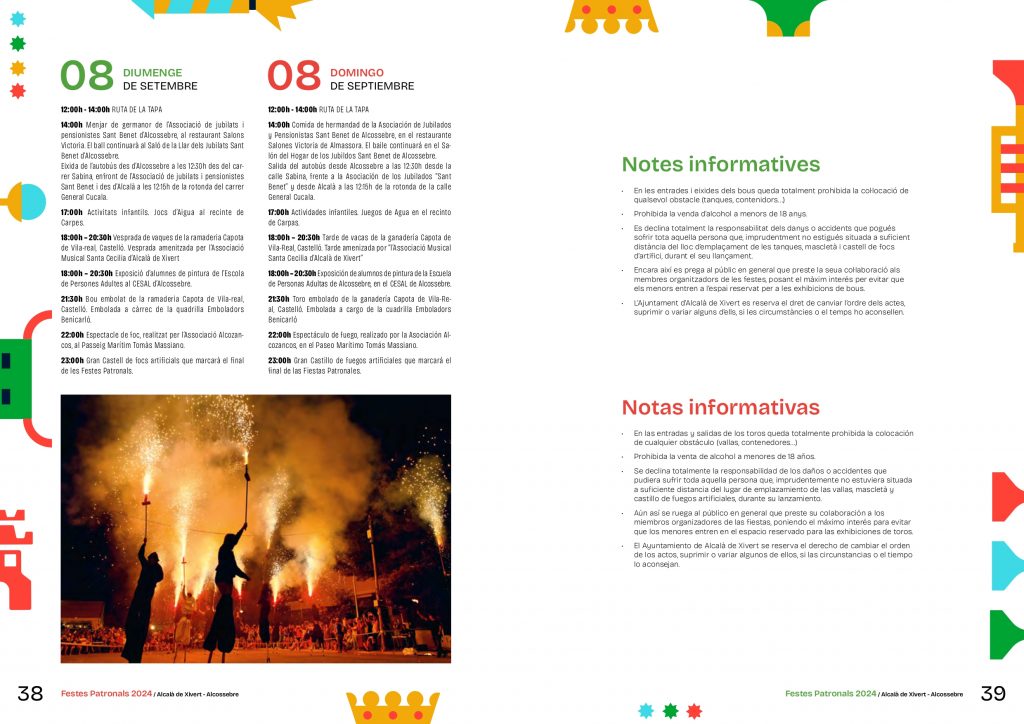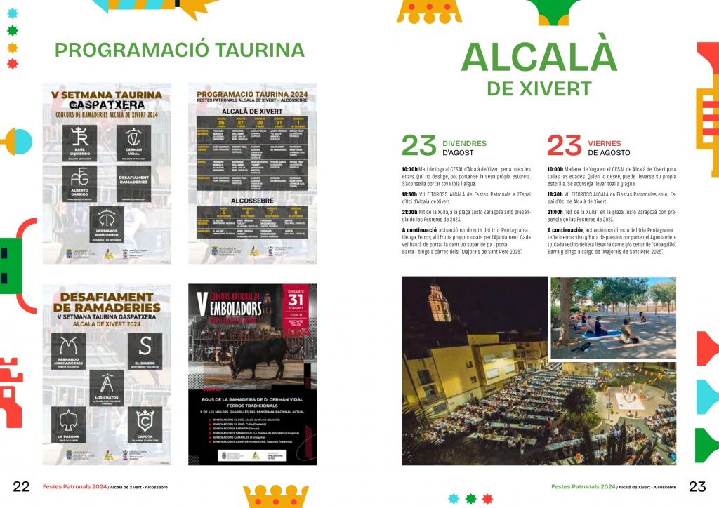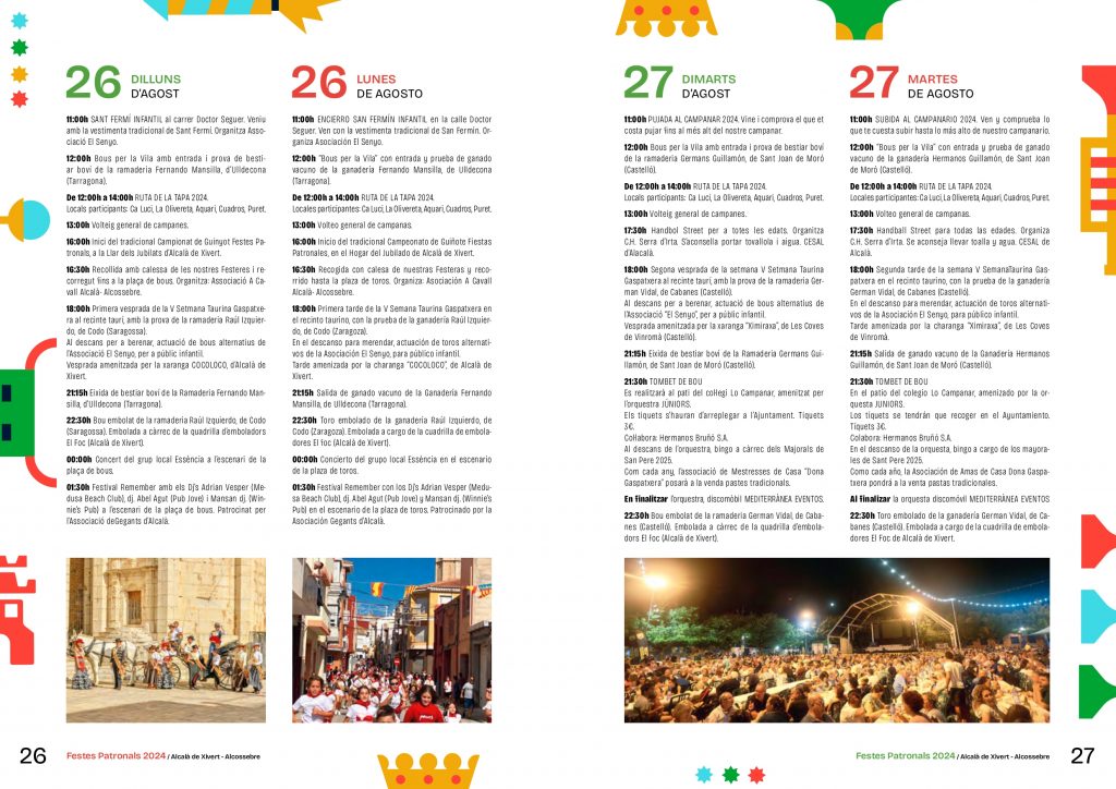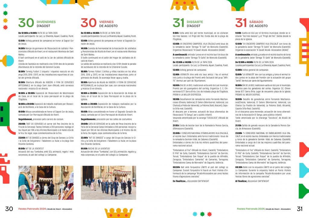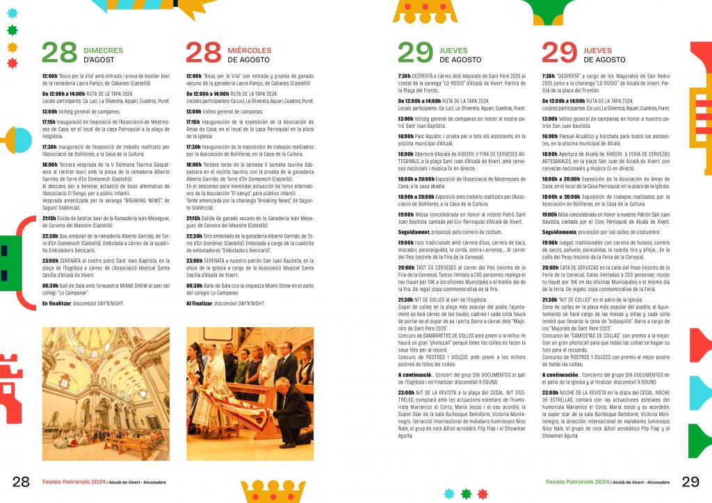 El municipio de Alcalà de Xivert vive sus Fiestas Patronales desde el 23 de agosto hasta el 1 de septiembre en honor a San Juan Bautista y al Sagrado Corazón de Jesús con la Nit de la Xulla como el acto más destacado de su programación.