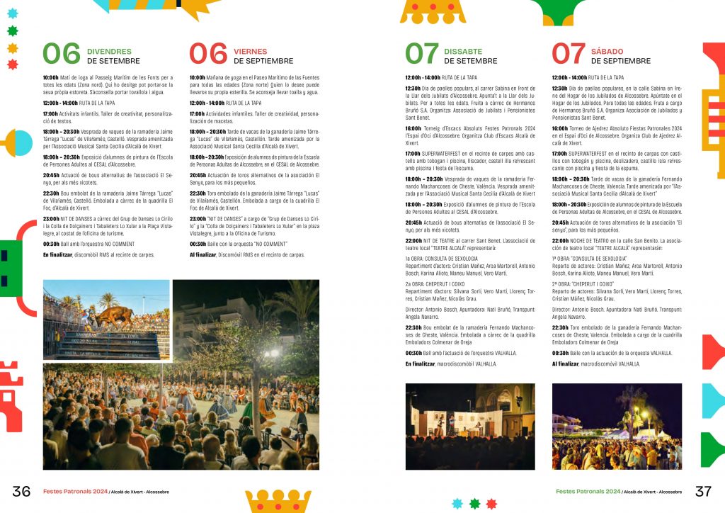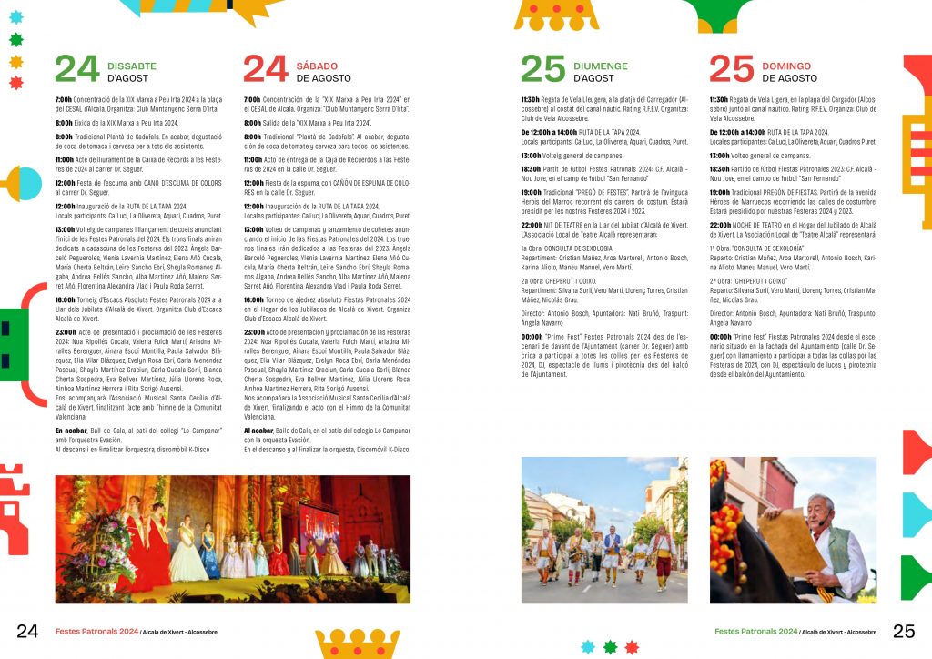 Este sábado el protagonismo de las Fiestas será para las festeras 2024 y festeras infantiles, con el acto de proclamación en la plaza de la Iglesia, donde serán proclamadas las jóvenes: Carla Cucala Sorlí, Blanca Cherta Sospedra, Eva Bellver Martínez, Julia Llorens Roca, Ainhoa Martínez Herrera y Rita Sorigó Ausensi. Las niñas son: Noa Ripollés Cucala, Valeria Folch Martí, Ariadna Miralles Berenguer, Ainara Escoí Montillo, Paula Salvador Blázquez, Elia Vilar Blázquez, Evelyn Roca Ebrí, Carla Menéndez Pascual y Shayla Martínez Craciu.
