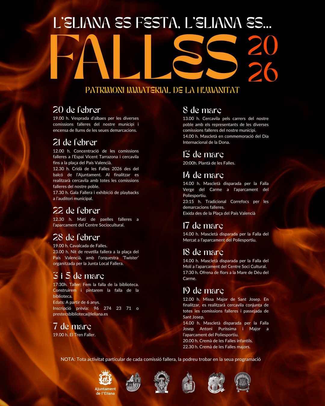 12.30 h. Cridà de les Falles 2026 des del balcó de l’Ajuntament. Al finalitzar es realitzarà cercavila amb totes les comissions falleres del nostre poble.