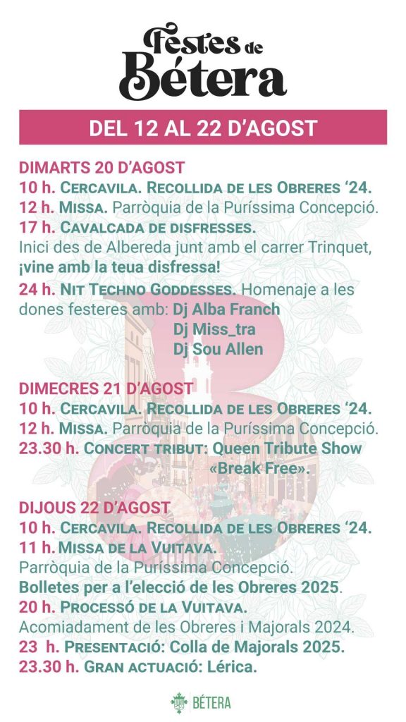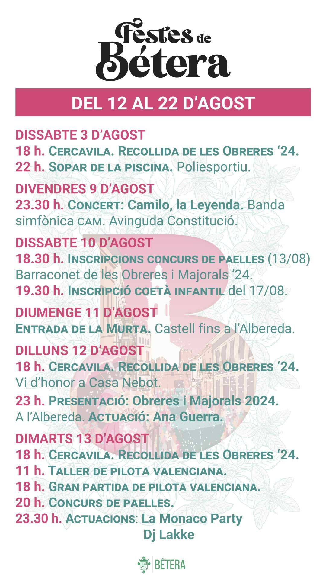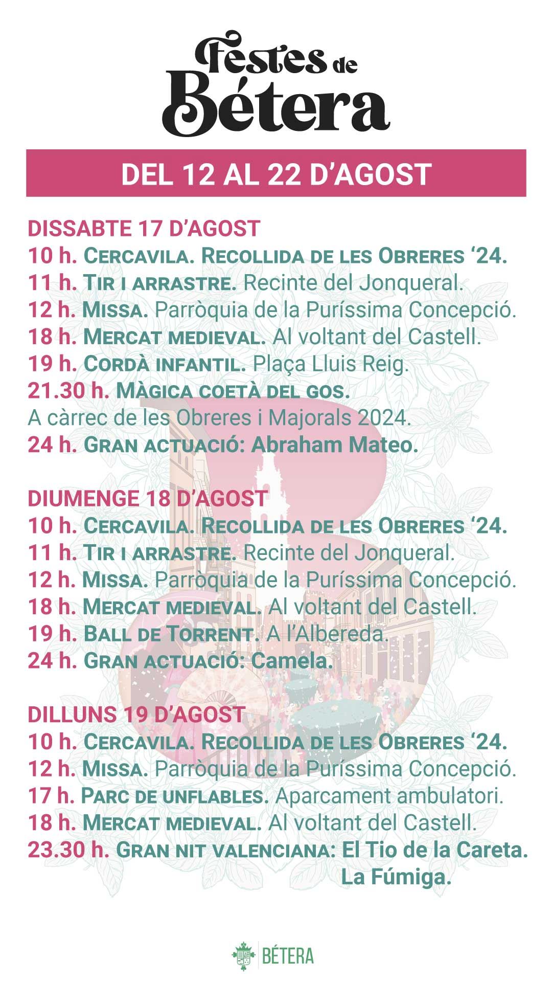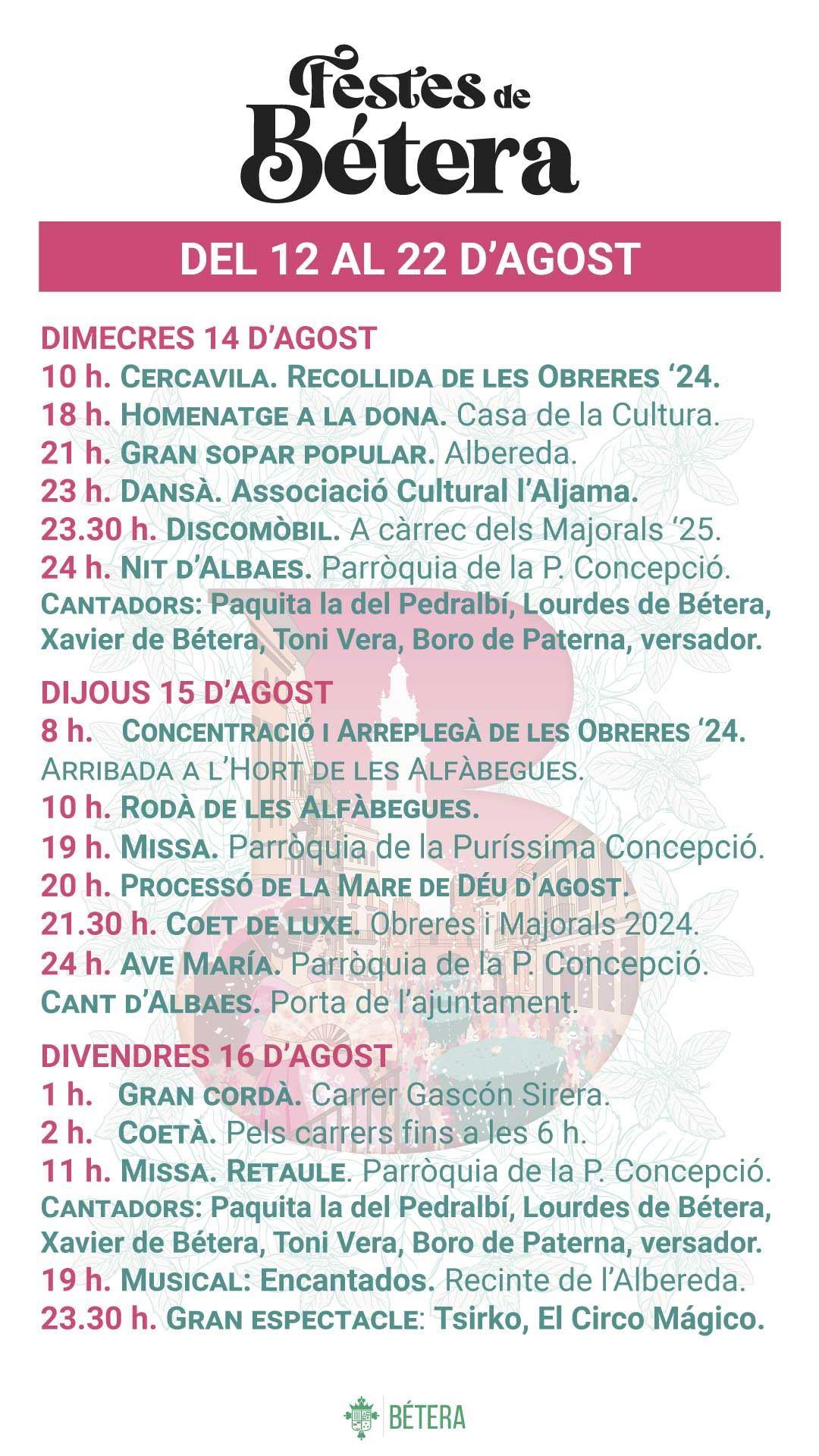- Del 12 al 22 d´agost, Bétera convida a gaudir de les seues majestuoses alfàbegues.