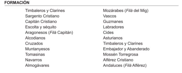 FORMACIÓN.– Capitán Moro con su fild y banda de musica; Alférez Moro con su fila y banda de música; Capitán Cristiano con su filá y banda de musica; Alférez Cristiano con su filá y banda de música; Sant Jordiet con su filá y banda de música; Asamblea General de la Asociación de San Jorge;imagen del Santo y banda de musica.