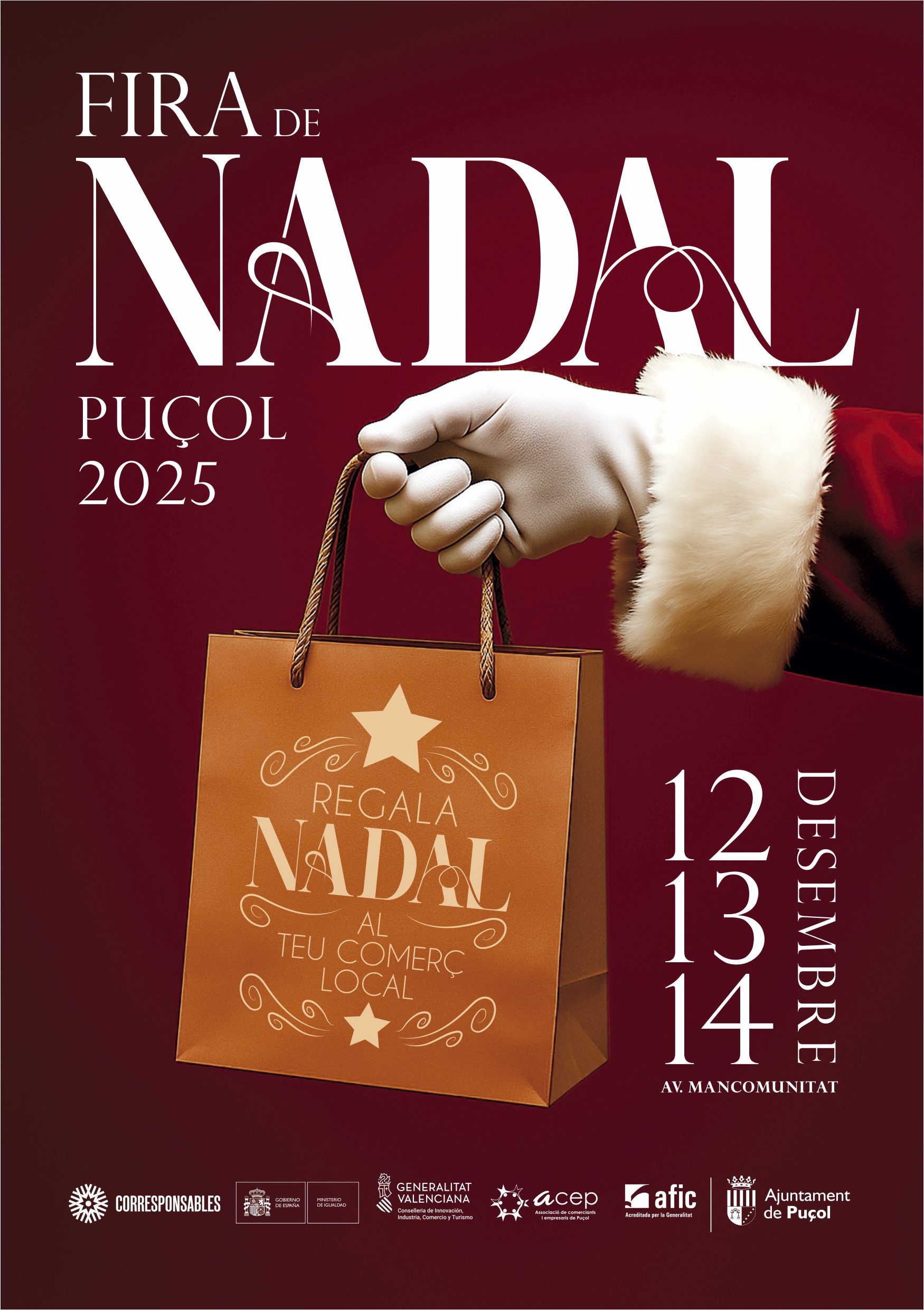 Bajo el eslogan «Regala Navidad en tu comercio local», los días 12, 13 y 14 de diciembre se celebra en la avenida Mancomunitat de l’Horta Nord una nueva edición de la Feria de Navidad, organizada por el Ayuntamiento de Puçol en colaboración con ACEP (Asociación de Comerciantes y Empresarios de Puçol), la Conselleria de Innovación, Industria, Comercio y Turismo y AFIC (Agencia para el Fomento de la Innovación Comercial).