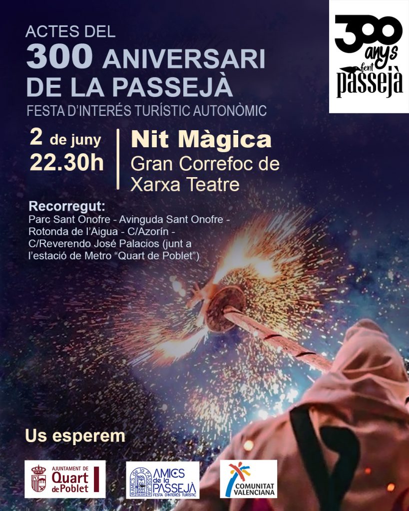 No obstant això, l’arrancada oficial de la festa serà el divendres 2 de juny, a les 21.00 hores, en la plaça de l’Ajuntament amb el tret de 21 salves que marquen l’inici de les celebracions. I serà una jornada inaugural molt especial, ja que la prestigiosa companyia Xarxa Teatre oferirà l’espectacle «Nit Màgica», amb un gran correfoc. Aquest xou s’ha representat a Corea del Sud, Taiwan, Itàlia, el Marroc o Dinamarca entre molts altres països. El recorregut partirà, a les 22.30 hores, des del parc de l’ermita de Sant Onofre i continuarà per l’avinguda Sant Onofre, la rotonda de l’Aigua i el carrer Azorín fins a l’esplanada al costat de l’estació de metro.