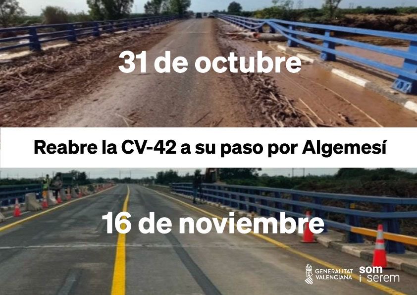 Durante los últimos días se ha trabajado en la restauración y limpieza del puente afectado en el punto kilométrico 4+580 de la CV-42 para restablecer esta mañana tanto la conectividad con el municipio de Algemesí como para reabrir el acceso a otras vías y al conjunto de la comarca de la Ribera Alta.