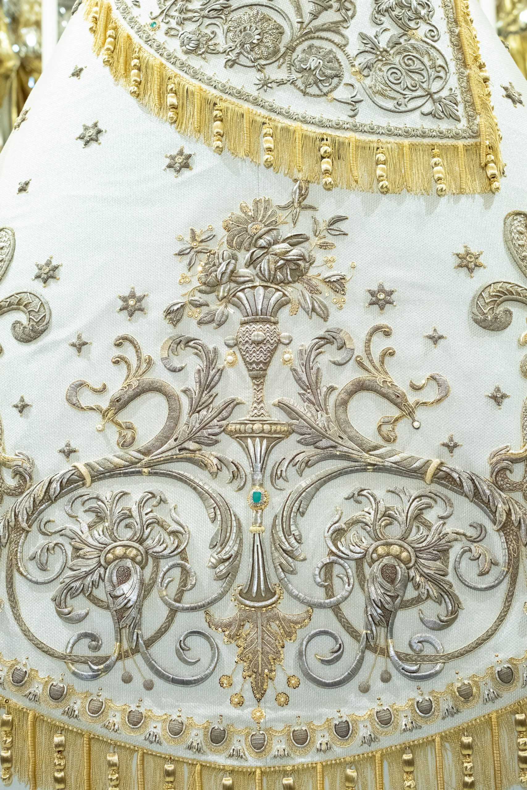 La tela base que compone la totalidad de la pieza es un piqué de tisú de plata hecha ex profeso para pasar los bordados originales, siguiendo el patrón que fue encontrado en el interior y era el original de 1915.  El conjunto está bordado en realce con hilo de oro y de plata sobre el tisú, y adornada con perlas y cristal.