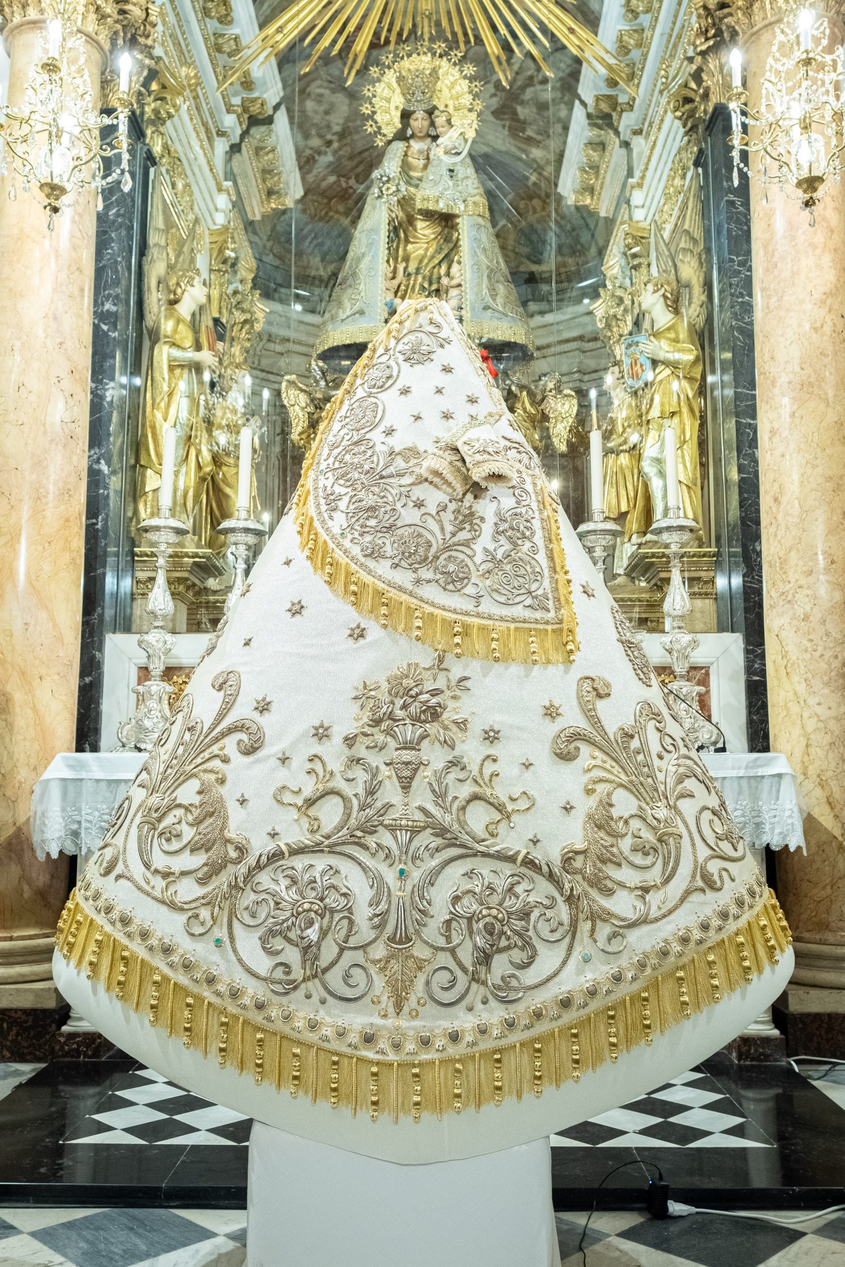 Como nos explica el director del Museo Mariano de la Virgen, Néstor Olucha, este manto se salvó de los saqueos de la contienda porque precisamente se encontraba en un taller restaurándose y cuando terminó este proceso de restauración coincidió con el fin de la guerra así es que se lo colocaron a la Virgen para su regreso de nuevo a la Basilica después de permanecer oculta en el Ayuntamiento.