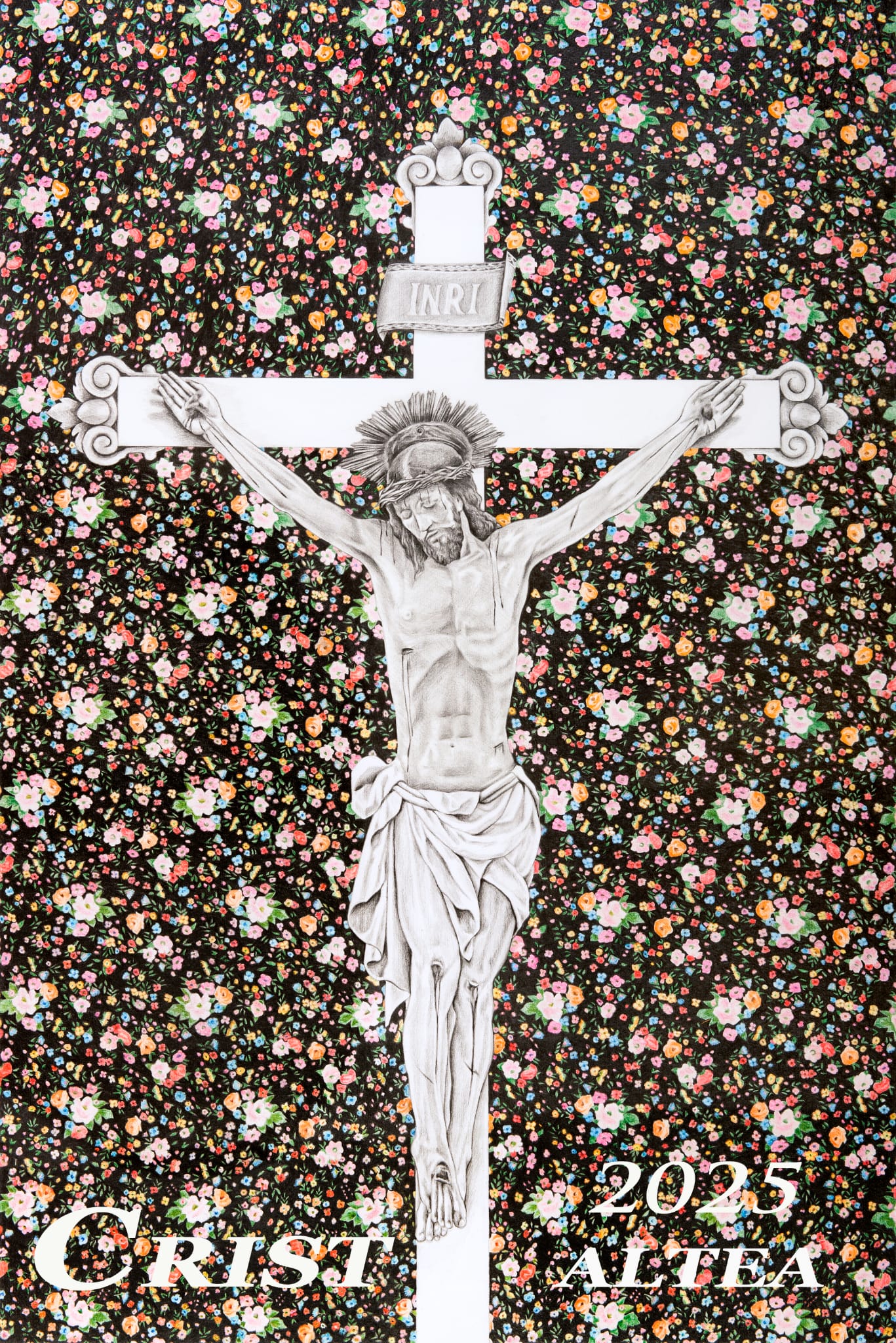 En cuanto a la descripción del cartel, realizada por su autora, “está inspirado en los colores y símbolos que representan nuestra fiesta local. Con la imagen central del Cristo realizado en grafito y los detalles florales que adornan el fondo representando la tela con la que se confeccionan las faldas de alteana”.