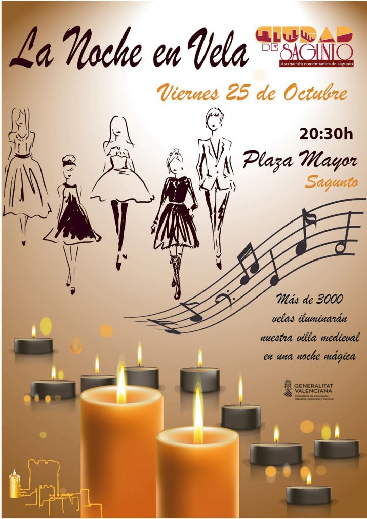 Aprovechando esta efeméride, la Asociación de Comerciantes Ciudad de Sagunto ha organizado la VIII edición de la ‘Noche en Vela’, en colaboración con la concejalía de Comercio y Mercados. Este evento comenzará en la plaza Mayor a las 19 horas con rutas guiadas y continuará a las 20:30 horas con un desfile de moda en el que la pasarela será la propia calle, que estará iluminada por 3.000 velas. Para hacer la noche aún más especial, el cuarteto de cuerda Candlelight amenizará el desfile de moda interpretando un concierto.
