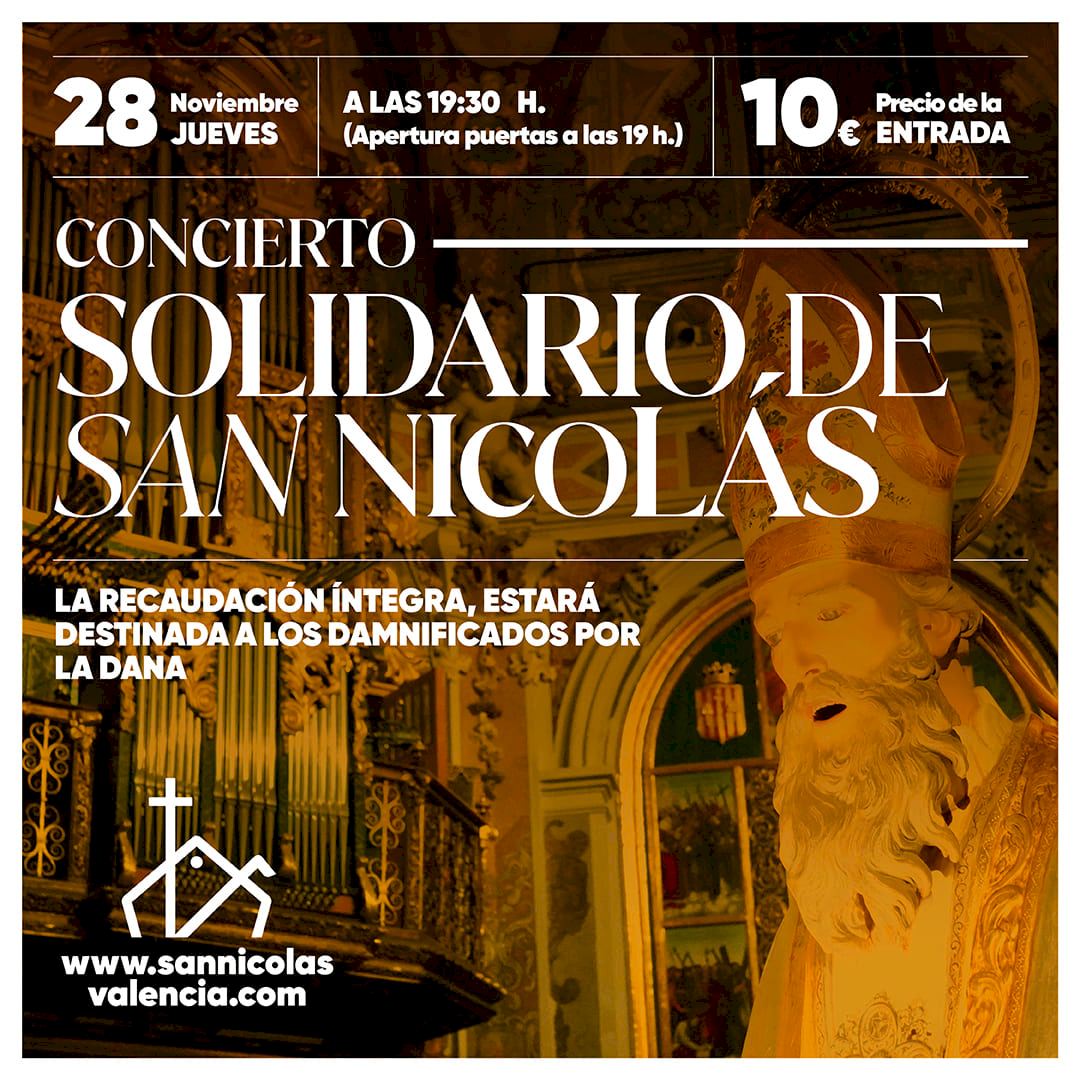 Como preparación a la Fiesta de San Nicolás que cada año se celebra el 6 de diciembre, la Parroquia de San Nicolás organiza un Concierto Solidario el próximo jueves día 28 de noviembre a las 19:30h. Toda la recaudación será destinada a los damnificados por la DANA.