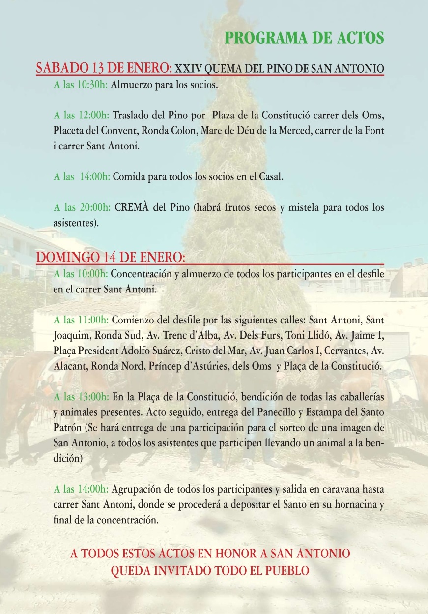 Habrá despertà, pasacalles (uno de ellos con visita a la hornacina dedicada al patrón y depositar la nueva imagen adquirida por la Comissió tras la desaparición de la histórica imagen el año pasado) y misa solemne el sábado 20 de enero, con el acompañamiento del coro.