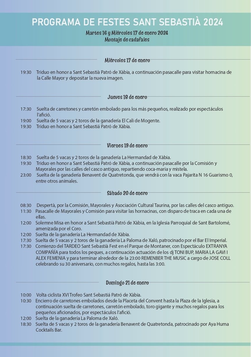 Tras Sant Antoni, llegan los festejos en honor al patrón de Xàbia, Sant Sebastià, que serán del 17 al 21 de enero. La parte religiosa la organiza la Comisión de fiestas y los Mayorales 2024 (Alberto Tur, María Luisa Ahuir, Toñi Alvárez, José Molina, Elvira Escortell, Nieves Escortell, Mari Carmen Sancho, Ana Bañuls, Mª Ángeles Espasa, Ana Rosa Lacueva, Lucía Andrés, Alba Carrió, Nuria Sart, Vicente Costa, Ángeles Buigues, Bartolomé Ros, Vivi Berruti, Lucía Costa, Paula Nevado, Laura Ros, Anna Salvador, Itziar Espasa, Miguel García, Patricia Barber, Santiago Fernández, Greta Manganini y Cristina Gallego) y se concentra el 20 de enero.