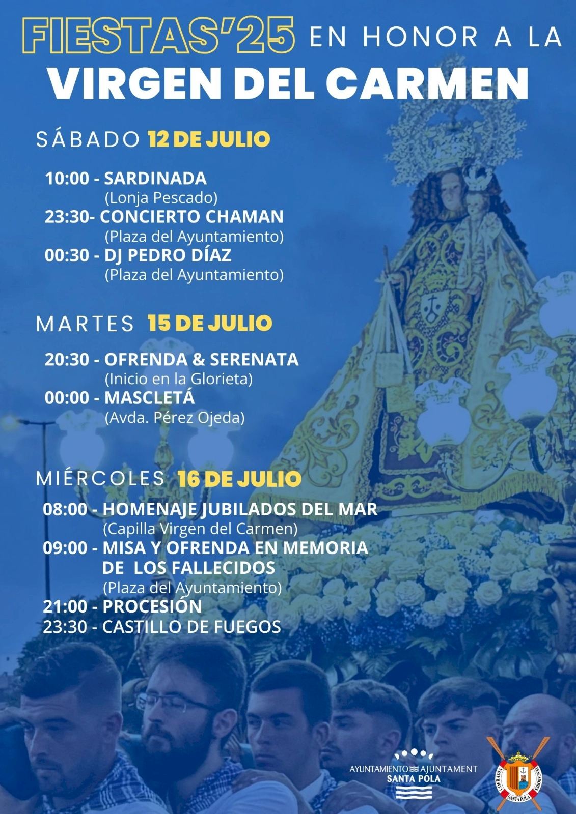 La Cofradía de Pescadores de Santa Pola, en colaboración con el Ayuntamiento de Santa Pola, organiza las fiestas en honor a su patrona, la Virgen del Carmen. Los actos comienzan este sábado 12 de julio con una sardinada en la lonja a las 10 de la mañana, y una noche musical con el concierto del grupo Chamán y el DJ Pedro Díaz en la plaza del ayuntamiento.