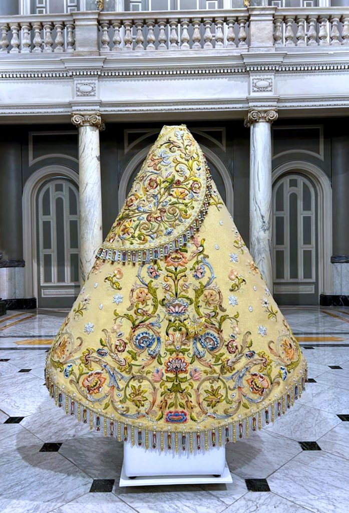 Este manto restaurado y sus elementos de conjunto será el que portará la imagen peregrina de la Virgen en los actos festivos del próximo domingo, día 14. Será, de hecho, el atavío que lucirá en la procesión general programada para la tarde de dicha jornada festiva. El conjunto, restaurado por el especialista Pedro Arrúe, ha sido elaborado a partir de las piezas de un terno arzobispal que data de la segunda coronación de la imagen, que tuvo lugar a mediados del pasado siglo, y que fue utilizado por al arzobispo Prudencio Melo.