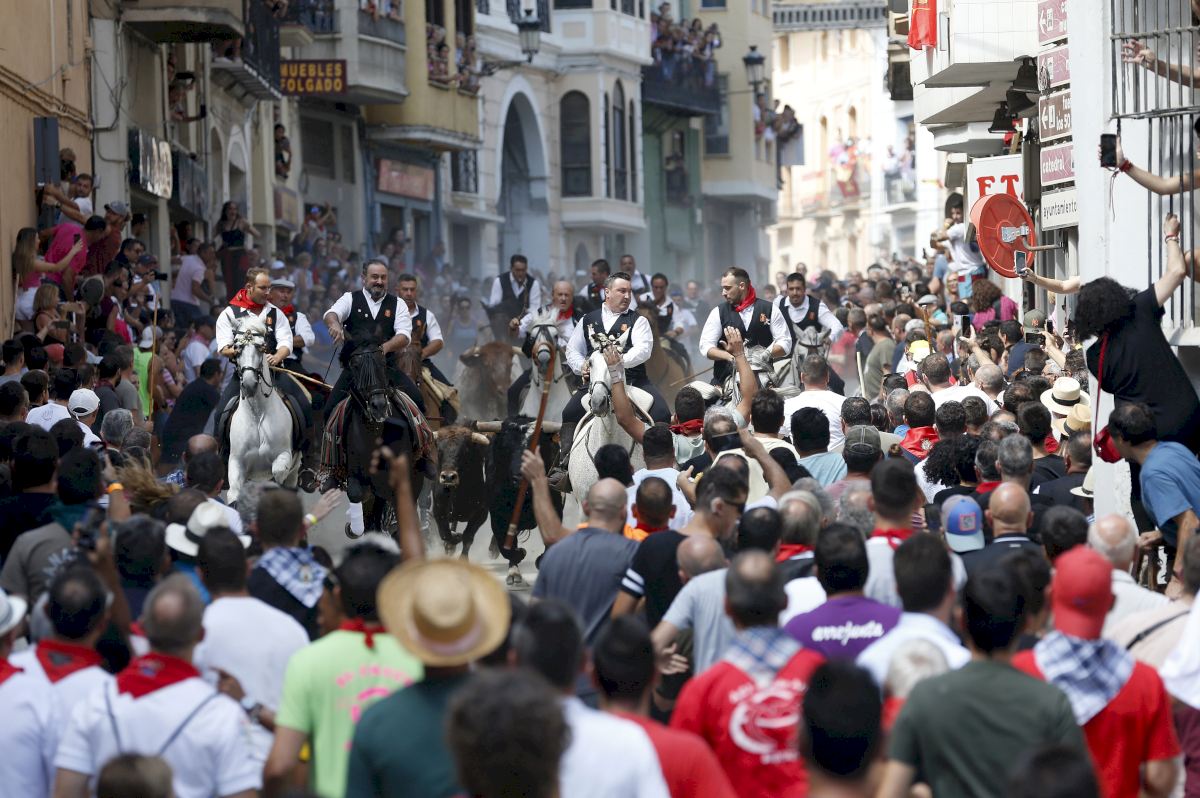 La primera Entrada de Toros y Caballos de Segorbe, después de dos años, ha sido rápida, elegante y con ritmo. Un ambiente festivo que han llenado la calle Colón y la plaza de la Cueva Santa con miles de aficionados.