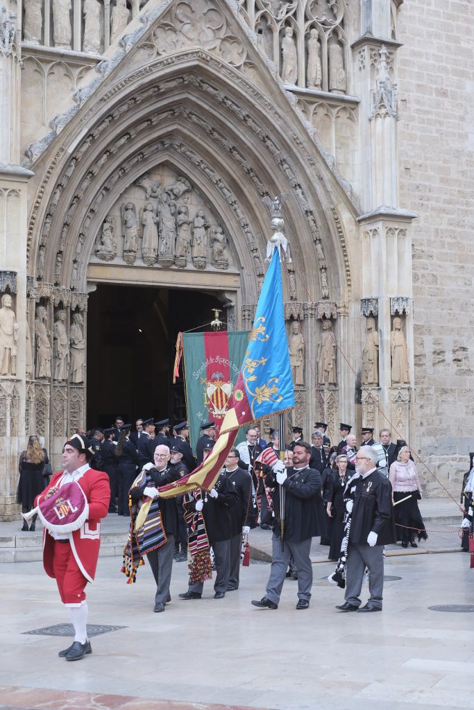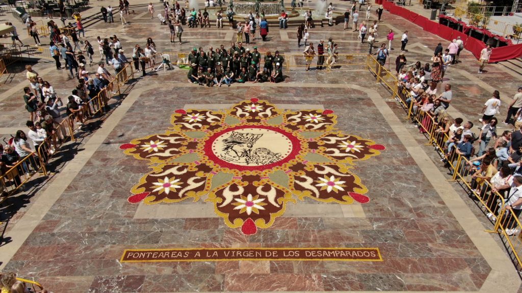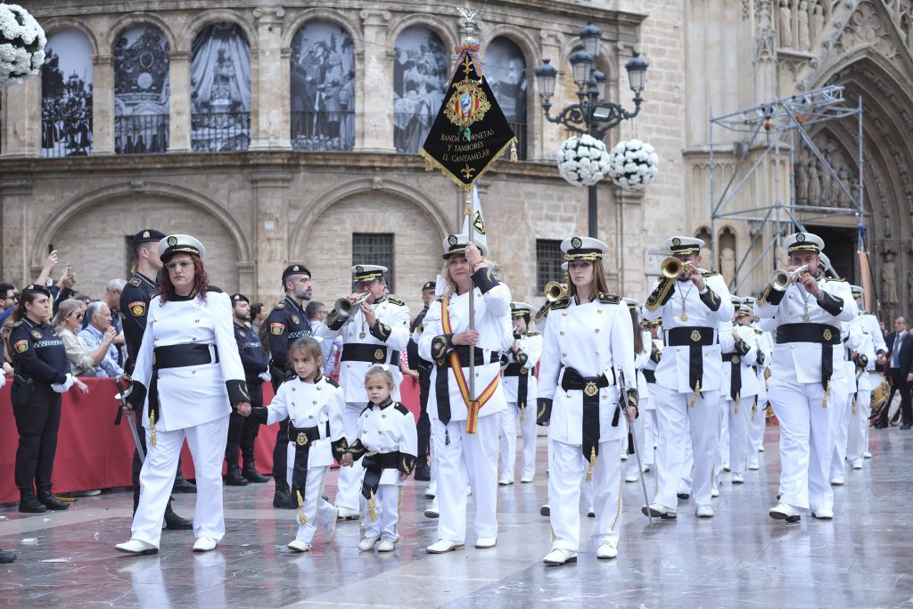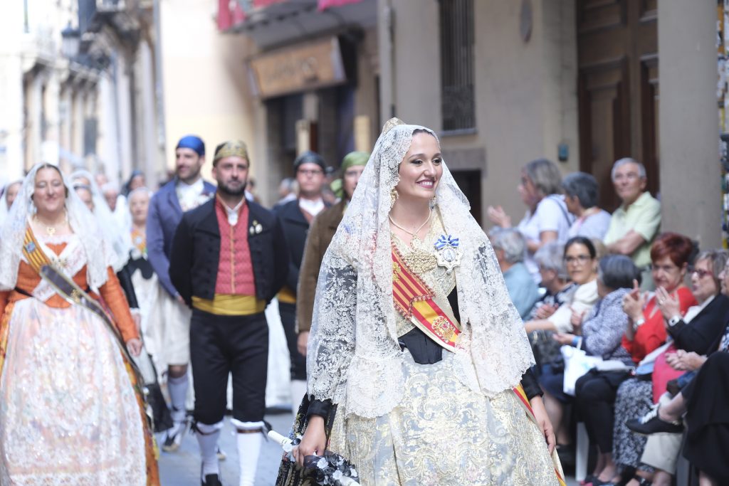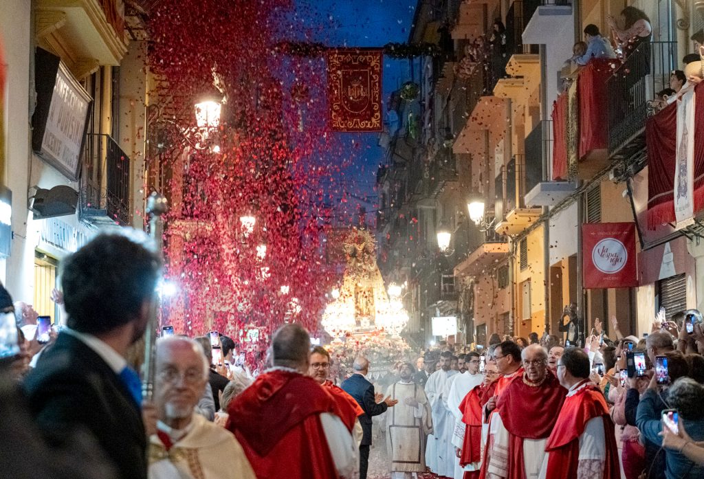 La imagen peregrina de la Mare de Déu luce en la procesión el manto conmemorativo del Centenario de la Coronación Canónica de la Mare de Déu sufragado por la Corte de Honor de la Virgen y restaurado por el artista y restaurador Pedro Arrúe. El manto ha sido elaborado a partir de las piezas de un terno que en 1941 fue usado por el entonces Arzobispo de Valencia, Prudencio Melo, en el acto de la segunda Coronación de la imagen de la Patrona.