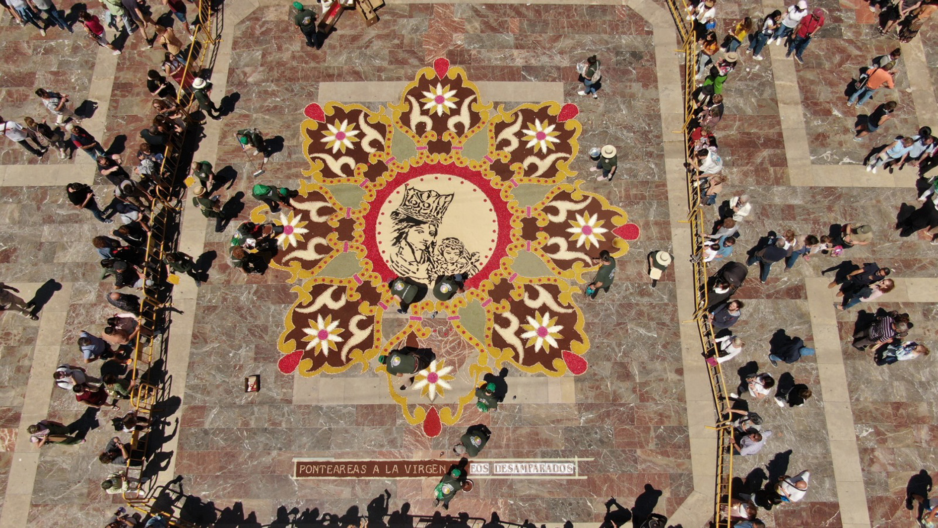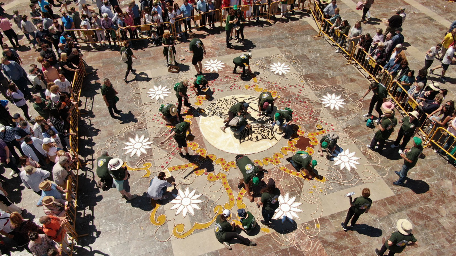 La procesión ha comenzado con la salida, desde la Catedral, de la imagen de la Virgen que ha pasado por encima de la alfombra de flores realizada por la asociación gallega de los Alfombristas do Corpus Christi de Ponteareas en el suelo de la Plaza de la Virgen, dedicada al Centenario de la Coronación.