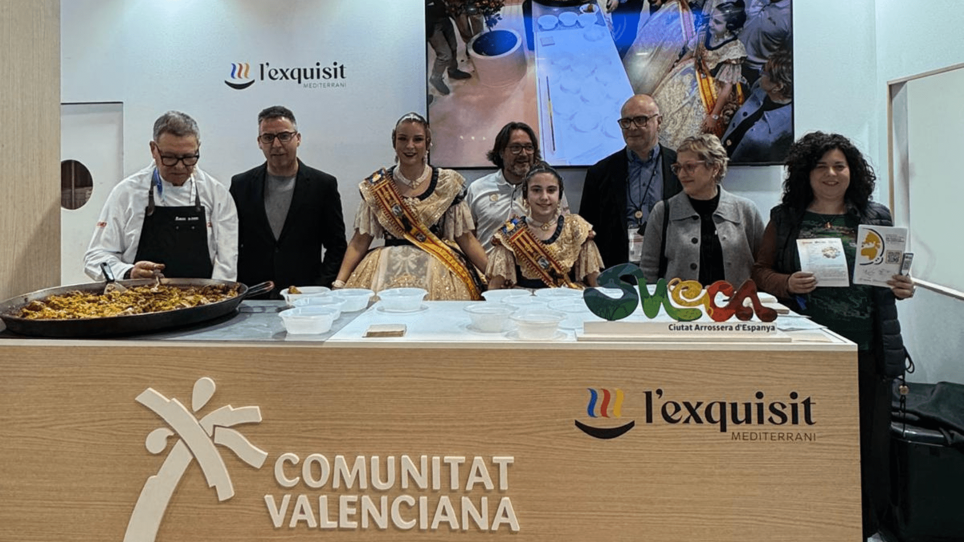 L’alcalde de Sueca, Julián Sáez; la regidora de Turisme i responsable del Concurs Internacional de Paella Valenciana de Sueca, Teresa Ribes; el regidor de Festes, Alfredo Planells; el director del Concurs, Tony Landete; el coordinador gastronòmic, Adolfo Cuquerella; i les falleres majors de Sueca, Isabel Fernández del Moral i Zoe Beltrán; han acudit a Fitur per a promocionar, a més de les excel·lències de la gastronomia del municipi, la seua cultura, festes, tradicions i paisatges naturals, entre molts altres atractius.