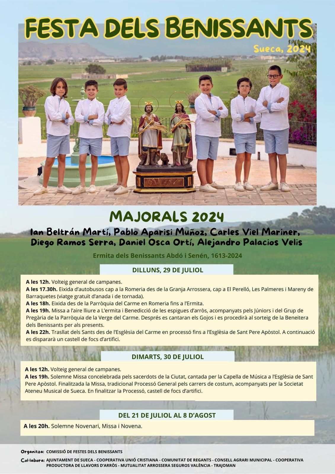 El municipi de Sueca es prepara, un any més, per a celebrar la tradicional festivitat dels Benissants de la Pedra, patrons secundaris de la ciutat als quals se’ls encomana la protecció de les collites. L’Ajuntament de Sueca, a través de la Regidoria de Festes, i la Comissió de Festes dels Benissants, han preparat una sèrie d’actes que s’iniciaran el dilluns 29 de juliol amb la romeria fins a la Muntanyeta dels Sants. L’eixida a peu es realitzarà a les 18 hores, des de la Parròquia del Carme. La Regidoria de Turisme oferirà, com és habitual, punts de refresc durant el recorregut amb orxata i llima granissada a fi de mitigar la calor.