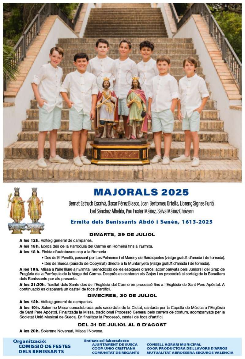 Sueca es prepara, un any més, per a celebrar la tradicional festivitat dels Benissants de la Pedra, patrons secundaris de la ciutat als qui se’ls encomana la protecció de les collites. L’Ajuntament de Sueca, a través de la Regidoria de Setmana Santa i Actes Religiosos, i la Comissió de Festes dels Benissants, han preparat una sèrie d’actes que s’iniciaran el dilluns 29 de juliol amb la romeria fins a la Muntanyeta dels Sants. L’eixida a peu es realitzarà a les 18 hores, des de la Parròquia del Carmen. La Regidoria de Setmana Santa i Actes Religiosos oferirà, com és habitual, punts de refresc durant el recorregut per als i les participants a fi de mitigar la calor.