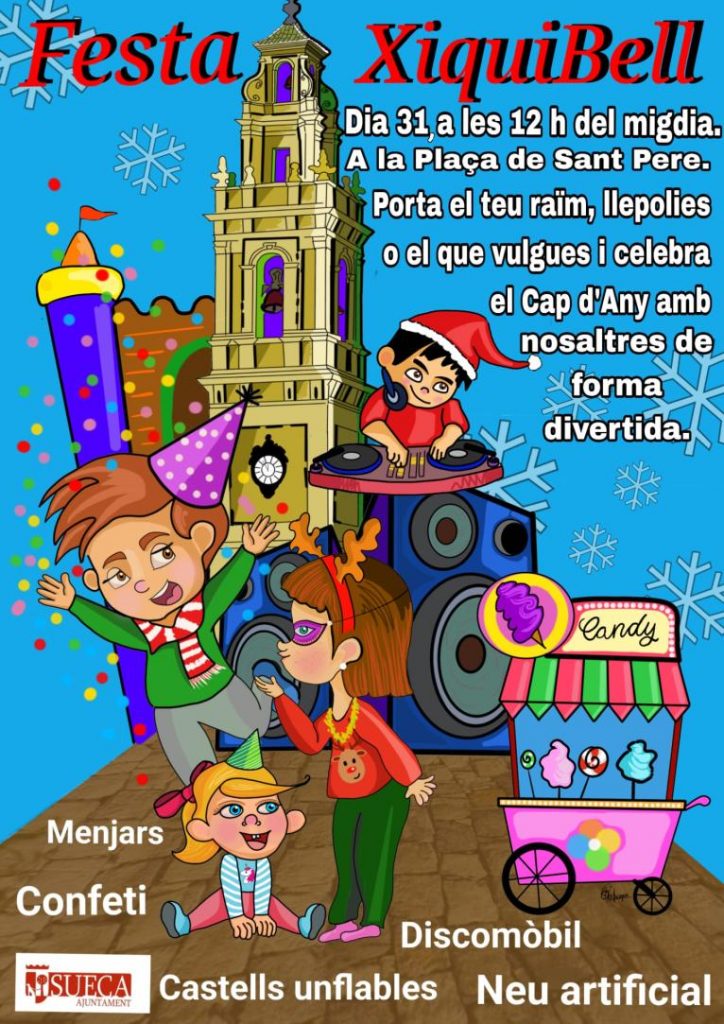 L’Ajuntament de Sueca, a través de la Regidoria d’Educació, ha preparat una festa especial, la Festa XiquiBell, per a tots els xiquets i xiquetes de Sueca amb motiu de la celebració del cap d’any. “El pròxim 31 de desembre, a partir de les 12 del migdia, en la plaça de Sant Pere i junt al campanar, celebrarem un cap d’any especial per als més xicotets de la casa en el qual podran gaudir d’una gran festa”, ha assenyalat el regidor responsable Joan Carles Vázquez.