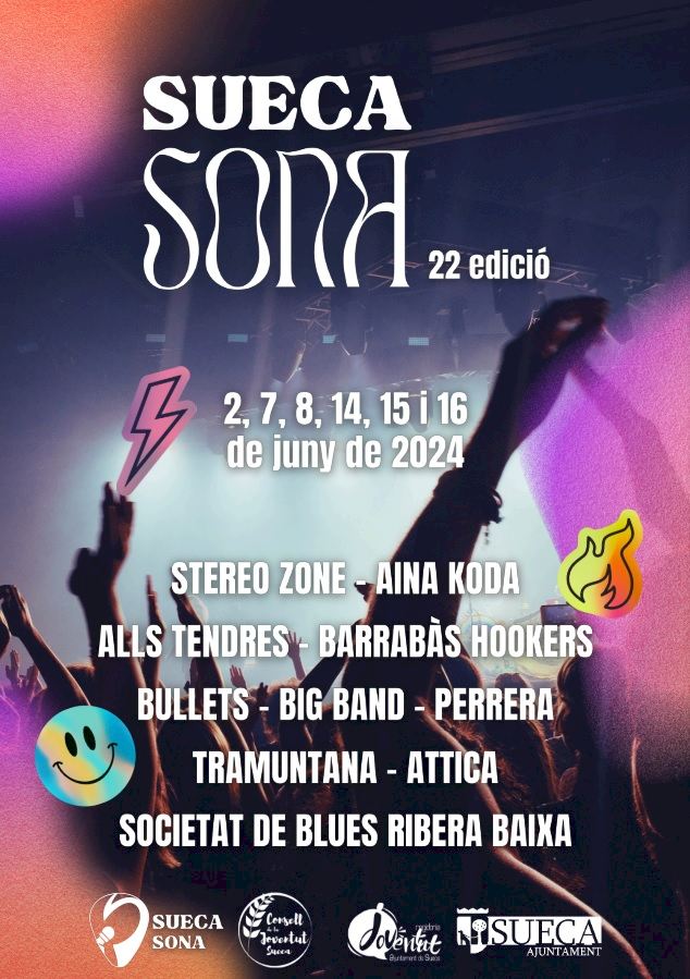 El festival de música Sueca Sona, que este año alcanza su 22 edición, ofrecerá los próximos días 2, 7, 8, 14, 15 y 16 de junio, un programa variado con propuestas musicales de solistas y grupos locales. Se trata de una iniciativa del Consell Local de la Joventut que cuenta con la colaboración del Ayuntamiento de Sueca, a través de la Concejalía de Juventud. “Nuestra intención es ofrecer unos espacios musicales públicos donde aficionados, profesionales y otros talentos de carácter local, puedan tener visibilidad. Año tras año, vemos cómo los grupos y artistas participantes van en aumento, desde diferentes estilos musicales. Agradecemos también la labor del Consell Local de la Joventut, y de algunos voluntarios, por su implicación y su apuesta por esta actividad que se ha convertido ya en un clásico anual en nuestra ciudad”, ha expresado la concejal de Juventud, Gema Navarro.