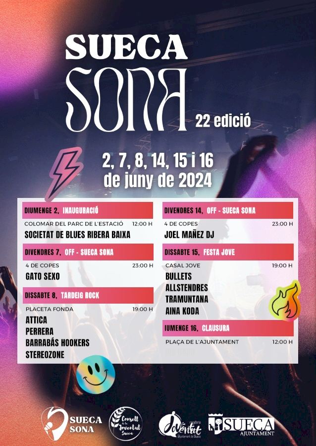 El festival se inaugurará el próximo domingo 2, a las 12 horas, con la actuación de la Societat de Blues Ribera Baixa, en el paseo de la Estación. El sábado 8, en la Placeta Fonda, a partir de las 19 horas, se ofrecerá una sesión de Tardeo Rock con las actuaciones de Attica, Perrera, Barrabás Hookers y Stereozone. Para el sábado 15, se ha preparado en el Casal Jove, a partir de las 19 horas también, una Festa Jove con la participación de Bullets, Allstendres, Tramuntana y Aina Koda. La clausura de esta edición tendrá lugar el domingo 16, a las 12 horas, en la plaza del Ayuntamiento. Por su parte, la programación OFF Sueca Sona, incluye las actuaciones de Gato Sexo, el viernes 7, a las 23 horas, en 4 de Copes; y de Joel Mañez DJ, el viernes 14, también a partir de las 23 horas en 4 de Copes.