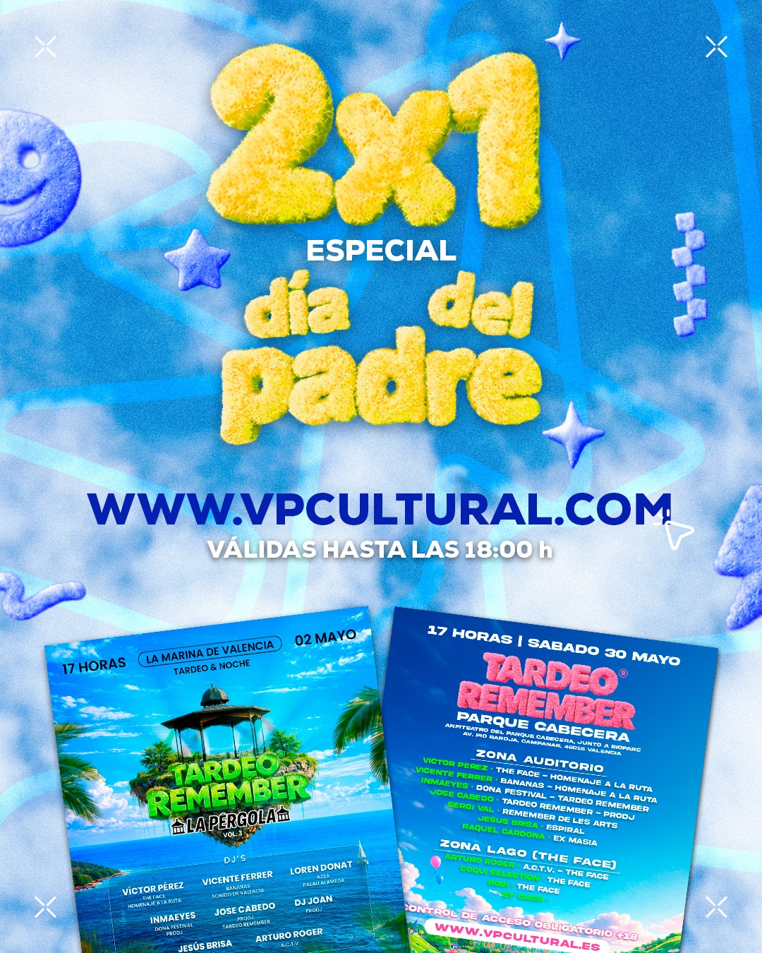— Tardeo Remember® lanza una promoción especial 2×1 en entradas con motivo del Día del Padre para sus próximas citas del viernes 2 de mayo y viernes 30 de mayo, dos jornadas que prometen reunir a miles de asistentes en torno al auténtico sonido remember en un ambiente festivo con música y emociones que marcaron a toda una generación