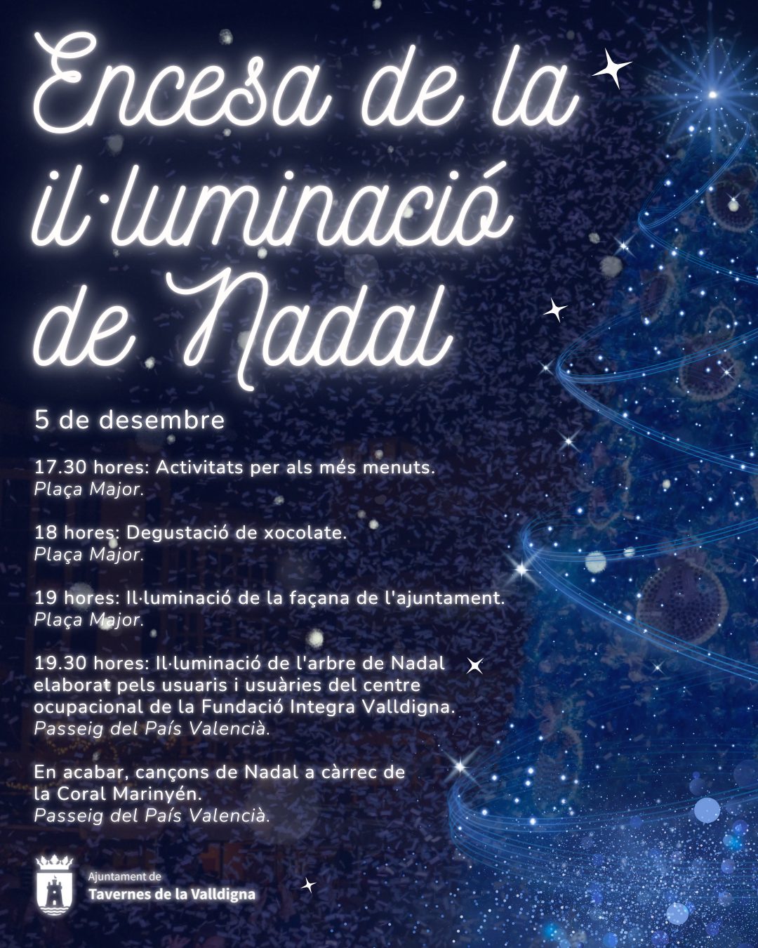 A les 19 hores es procedirà a l’encesa de la il·luminació de la façana de l’ajuntament, una de les novetats del Nadal d’enguany, i mitja hora després, al passeig del País Valencià s’encendrà tota la il·luminació de la localitat. Això sí, serà a la vegada que s’il·lumine l’arbre de Nadal creat pels usuaris i usuàries del centre ocupacional de la Fundació Integra Valldigna. Una festa que anirà acompanyada pel concert de la Coral Marinyén.