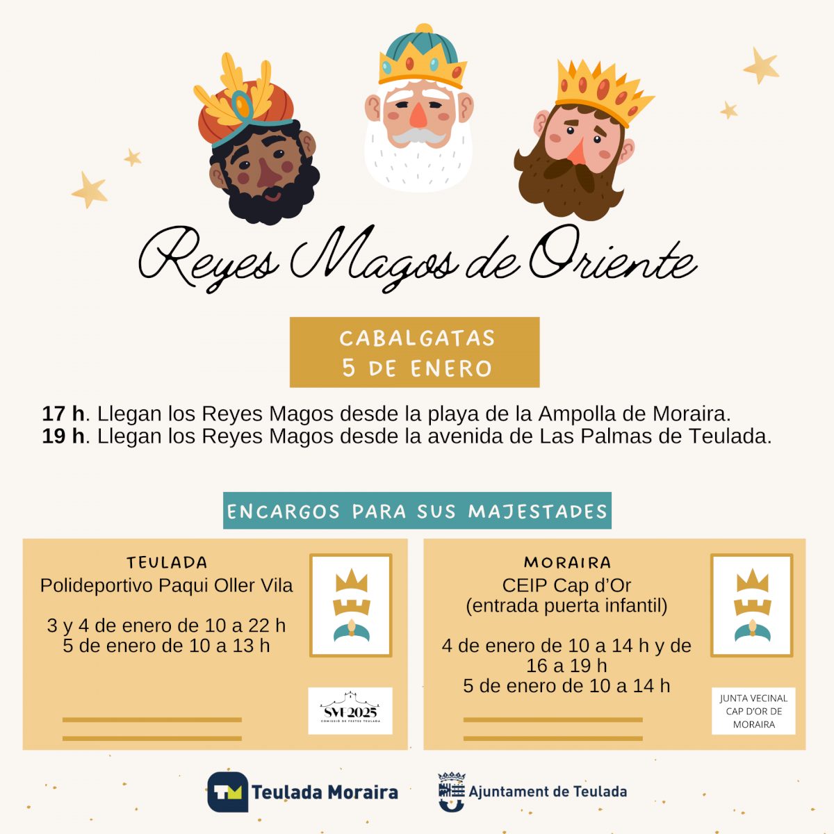 La concejalía de Fiestas del Ayuntamiento de Teulada, delegada en Rosana Caselles, en colaboración con la Comisión de Fiestas Sant Vicent Ferrer de Teulada 2025 y la Junta Vecinal Cap d’Or de Moraira, han preparado la llegada de los Reyes Magos de Oriente para que los más pequeños y pequeñas puedan disfrutar de ellos el próximo domingo 5 de enero.