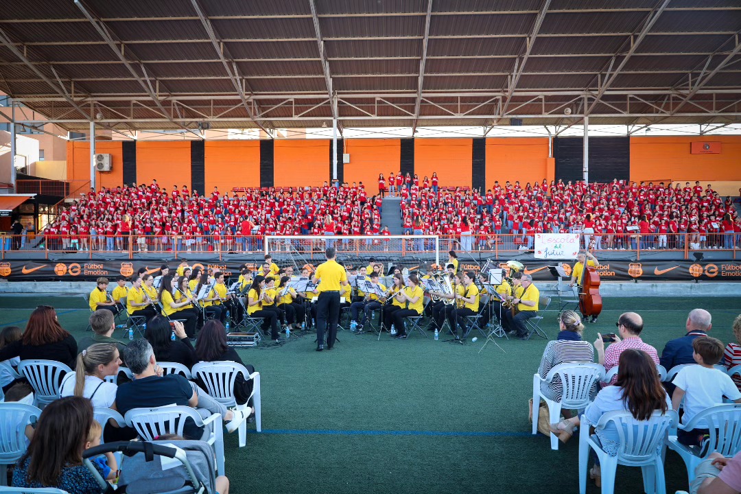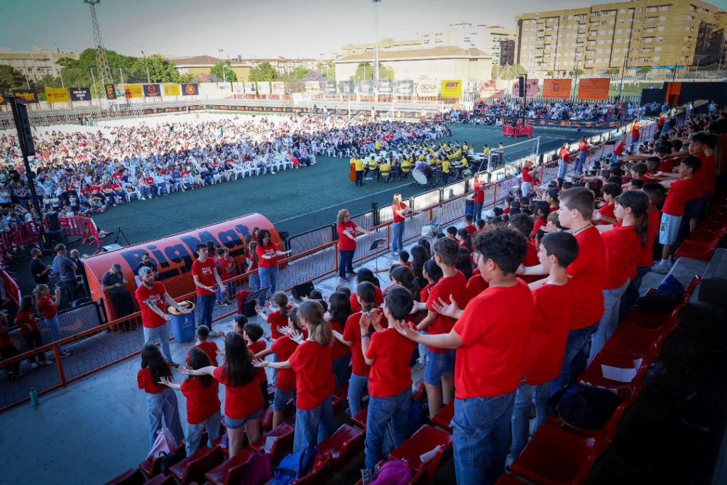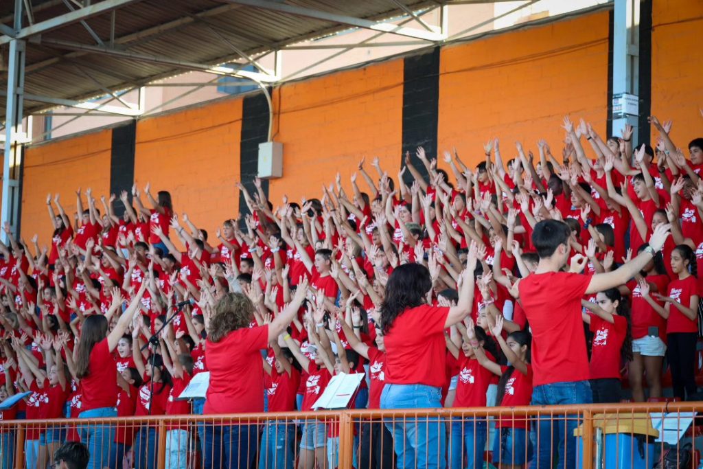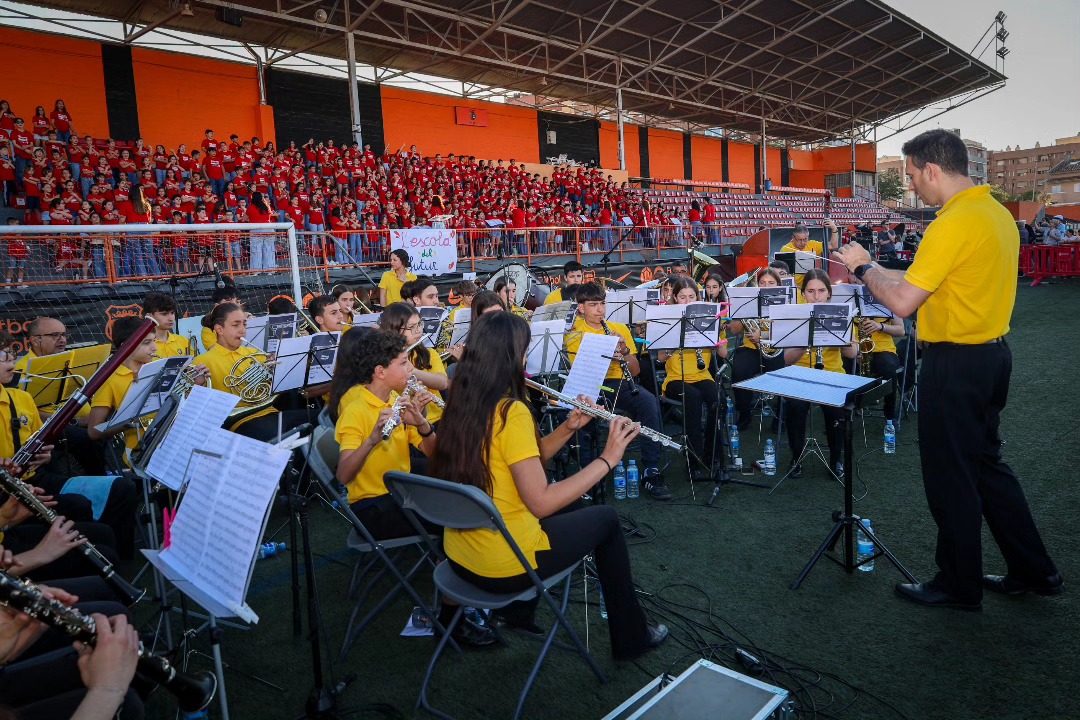 El Campo de Fútbol Sant Gregori de Torrent se convirtió este viernes 16 de mayo en el escenario de un encuentro educativo y musical que reunió a más de 600 escolares de Educación Primaria de diez colegios de Torrent y uno de Sedaví, acompañados por la Banda Juvenil del Círculo Católico de Torrent. El evento, enmarcado en el programa Innov@cant del proyecto Innov@ARTS, hizo vibrar al público con la interpretación de la cantata escénica “Manos pequeñas, grandes acciones”.