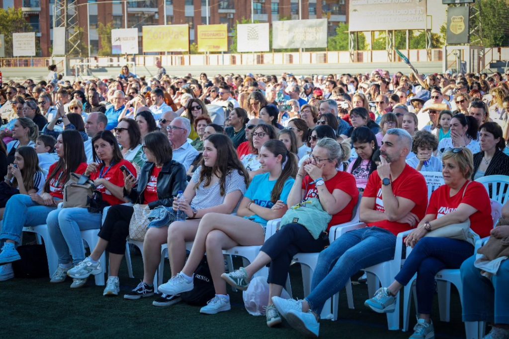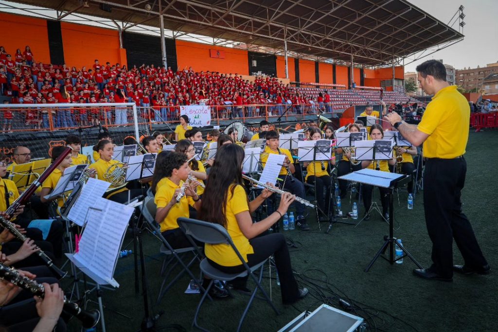 La alcaldesa de Torrent, Amparo Folgado, asistió al acto y dirigió unas palabras de bienvenida a todos los alumnos, docentes, familiares y asistentes que llenaban las gradas del campo “Torrent acoge con los brazos abiertos un evento como este, donde la música, la educación y los valores se unen. Felicito a todos los participantes, porque habéis demostrado que con talento, esfuerzo y trabajo en equipo se pueden hacer cosas maravillosas”.
